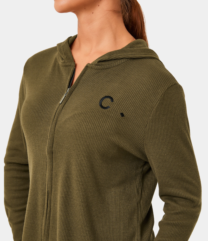 :: Halara Hooded Zipper Letter Embroidery Plain Ribbed Jacket Women's Tops Golden Granola | IMNHLPY-09