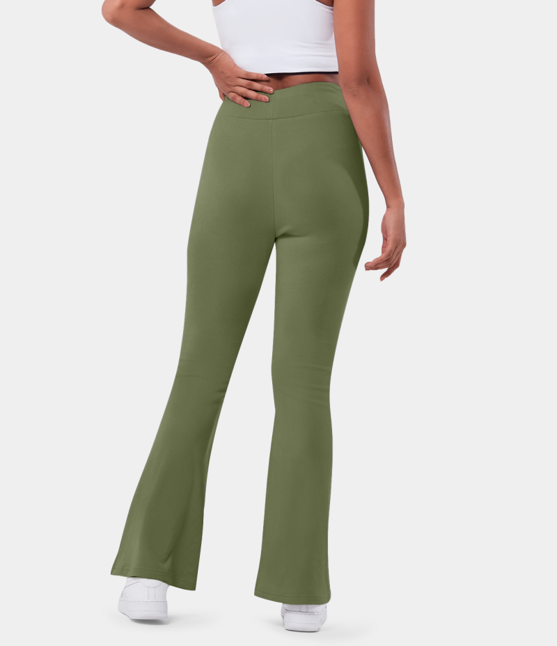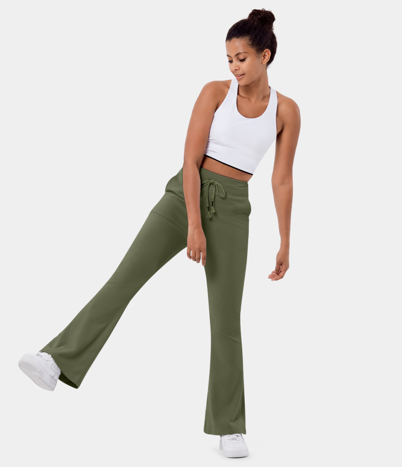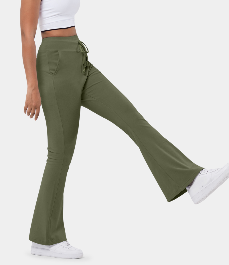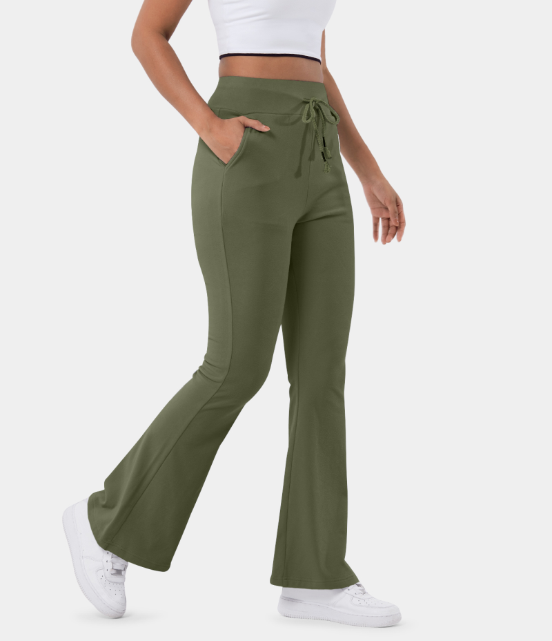 :: Halara In My Feels High Waisted Drawstring Pocket Plain Flare Long Women's Pants Moss Green | 720164-MHJ