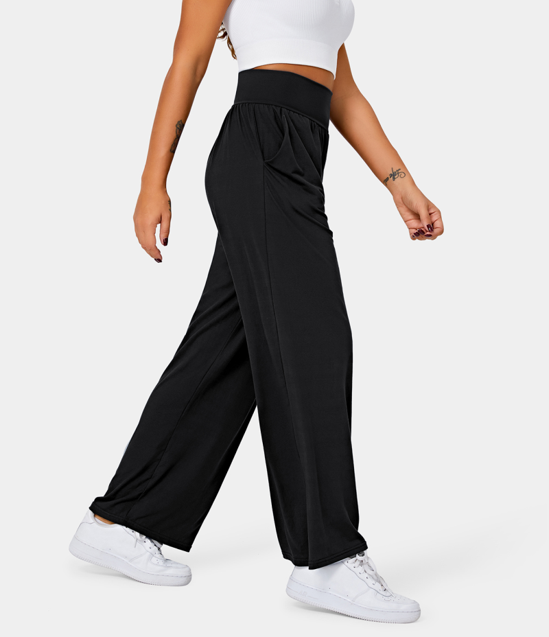 Halara In My Feels High Waisted Side Pocket Plain Wide Leg Women's Pants Black | 586392-QNK