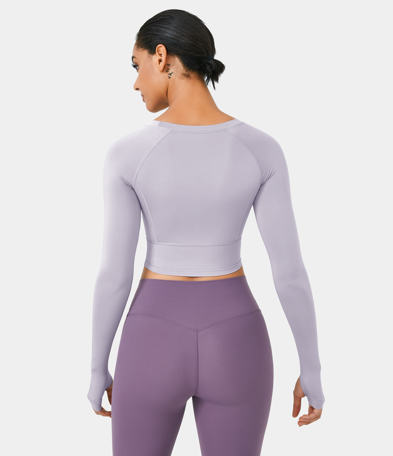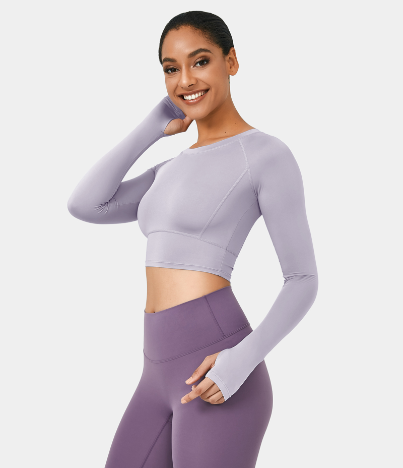 :: Halara In My Feels Solid Thumb Hole Cropped Sports Women's Tops Cloud Grey | RUZJTFO-87