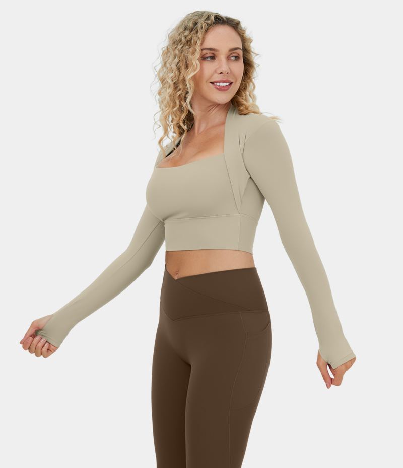 :: Halara Long Sleeve Thumb Hole Cropped Yoga Sports Women's Tops Brown Rice | HUGCLNA-87