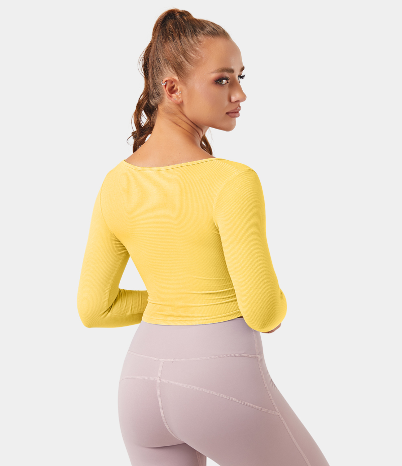:: Halara Long Sleeve Tie Front Ruched Cropped Sports Women's Tops Cream Gold | AIFNDUY-29