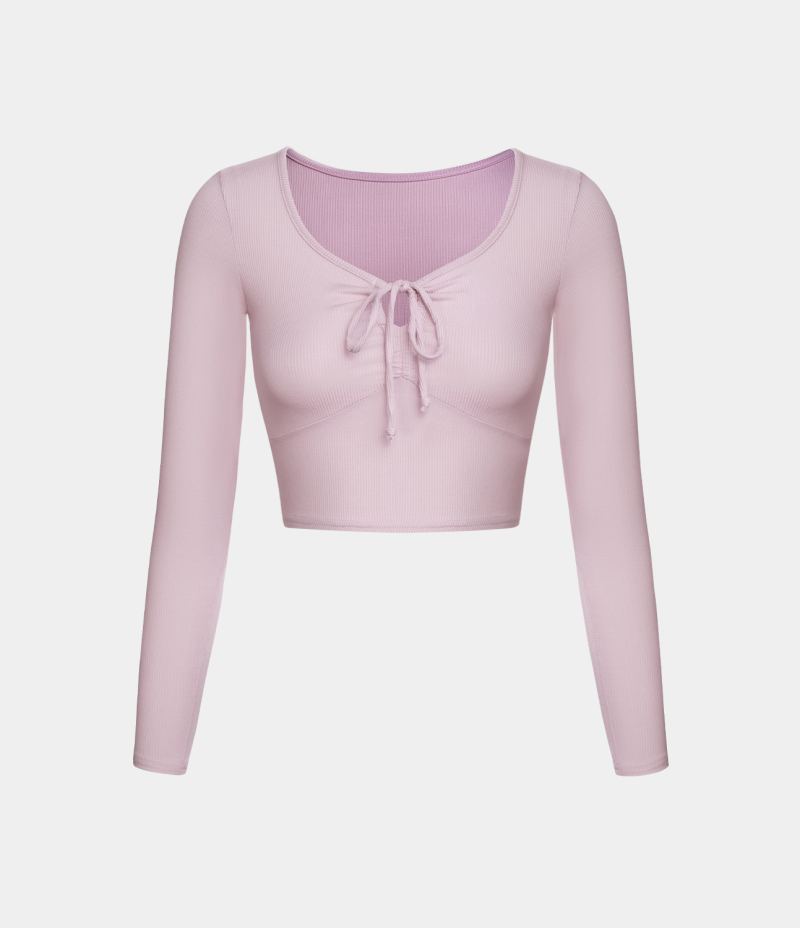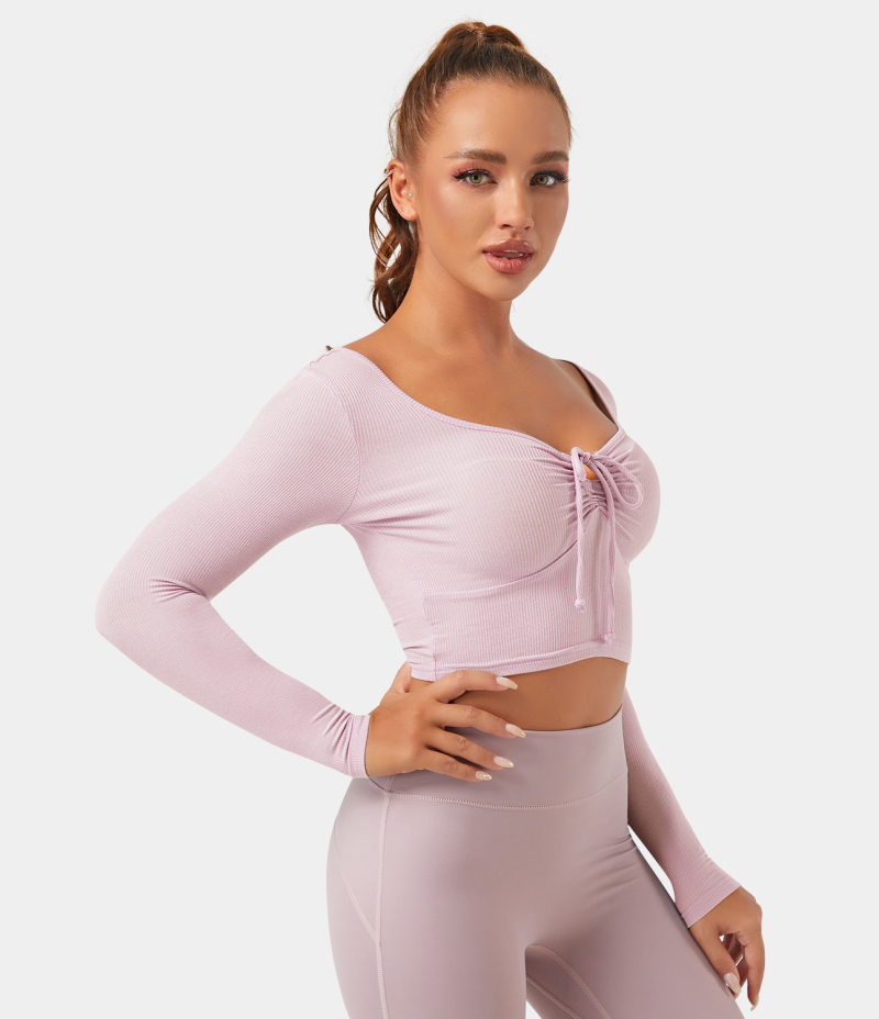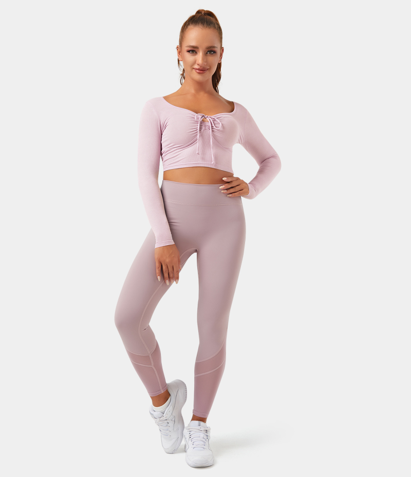 :: Halara Long Sleeve Tie Front Ruched Cropped Sports Women's Tops Putty Pink | IGSVONX-64