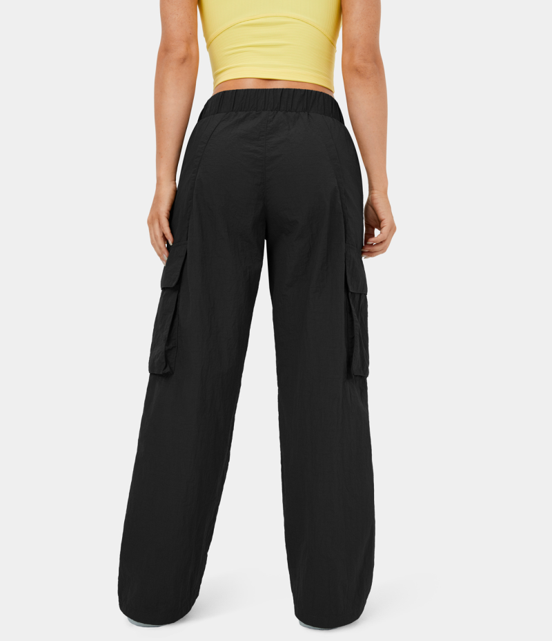 :: Halara Low Rise Belted Button Zipper Side Pocket Wide Leg Casual Cargo Women's Pants Black | 932075-LAX