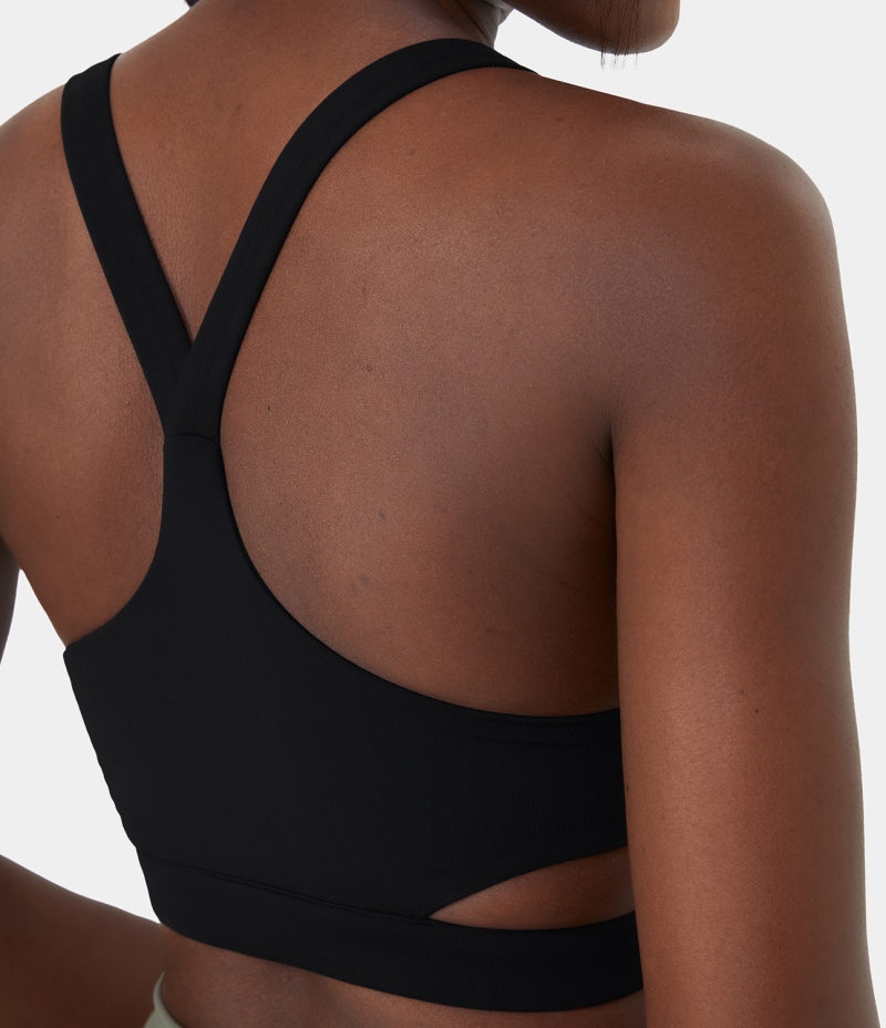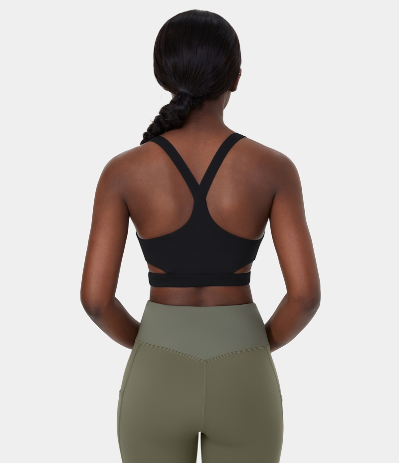 :: Halara Low Support Crossover Hem Cut Out Racerback Yoga Sports Bra Women's Tops Black | QYUAJVS-63