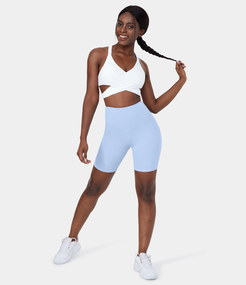 Halara Low Support Crossover Hem Cut Out Racerback Yoga Sports Bra Women's Tops White | KUXAEOD-82
