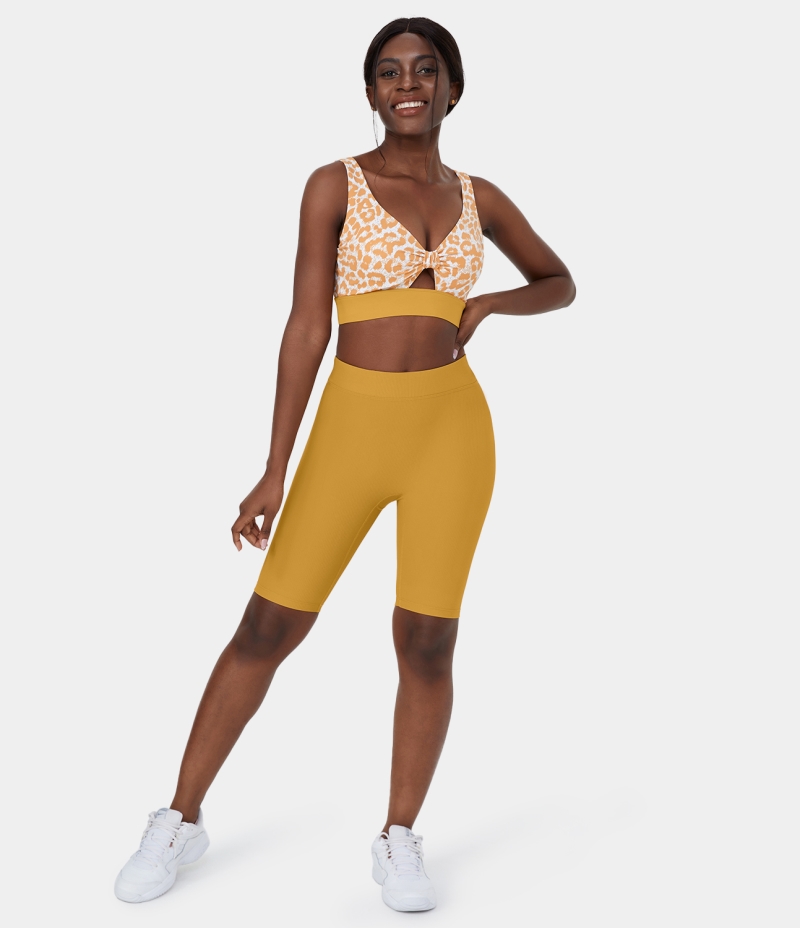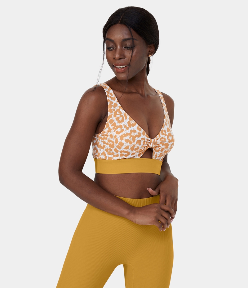 :: Halara Low Support Leopard Print Ruched Cut Out Yoga Sports Bra Women's Tops Yellow Leopard Print | LHBTSDA-95