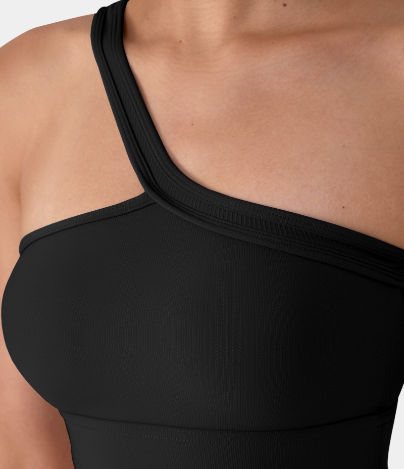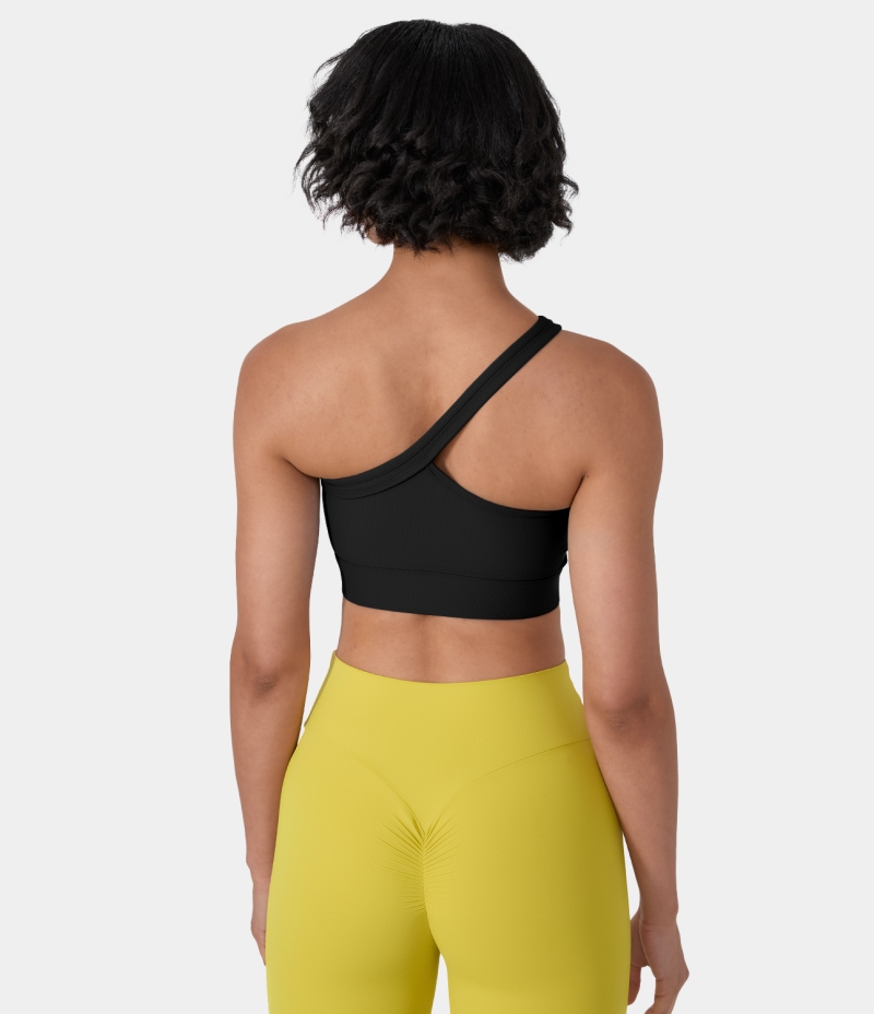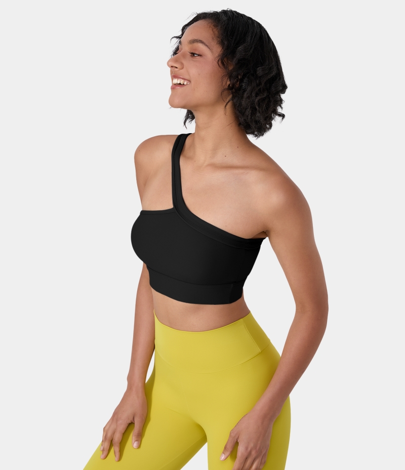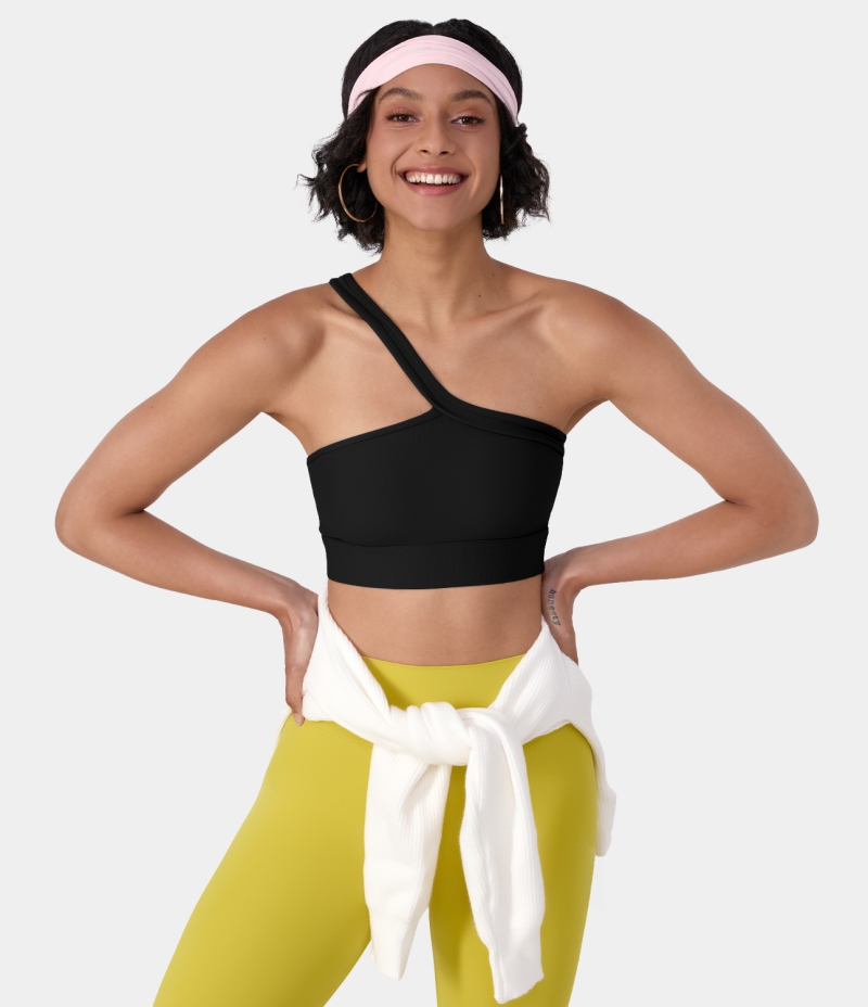 :: Halara Low Support Single Strap Ribbed Yoga Sports Bra Women's Tops Black | XZHSUIK-81