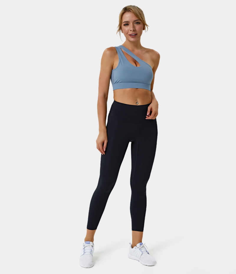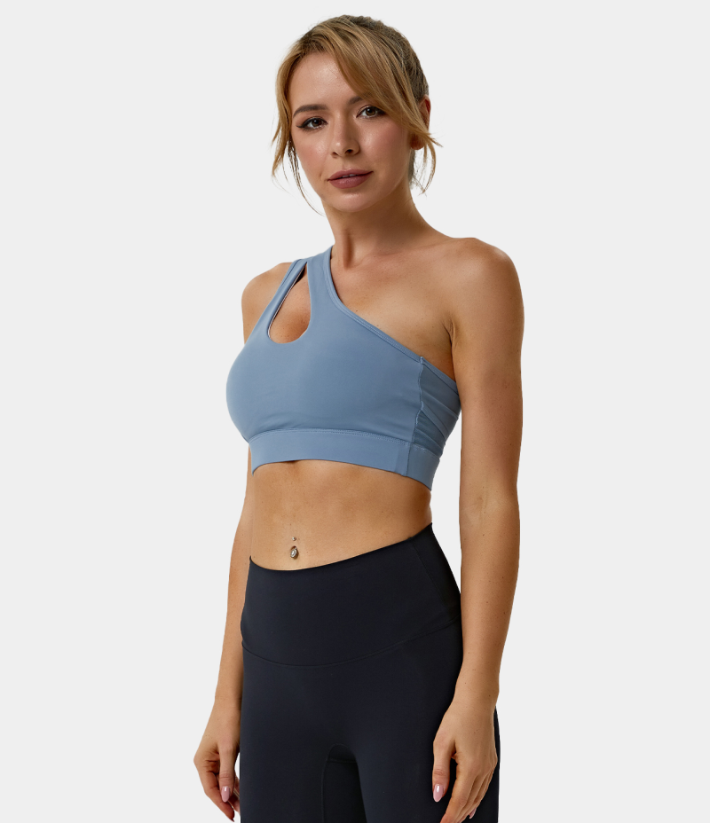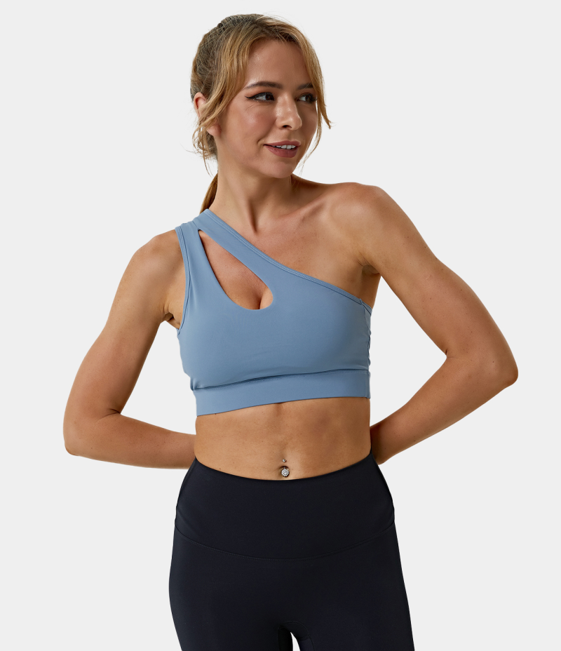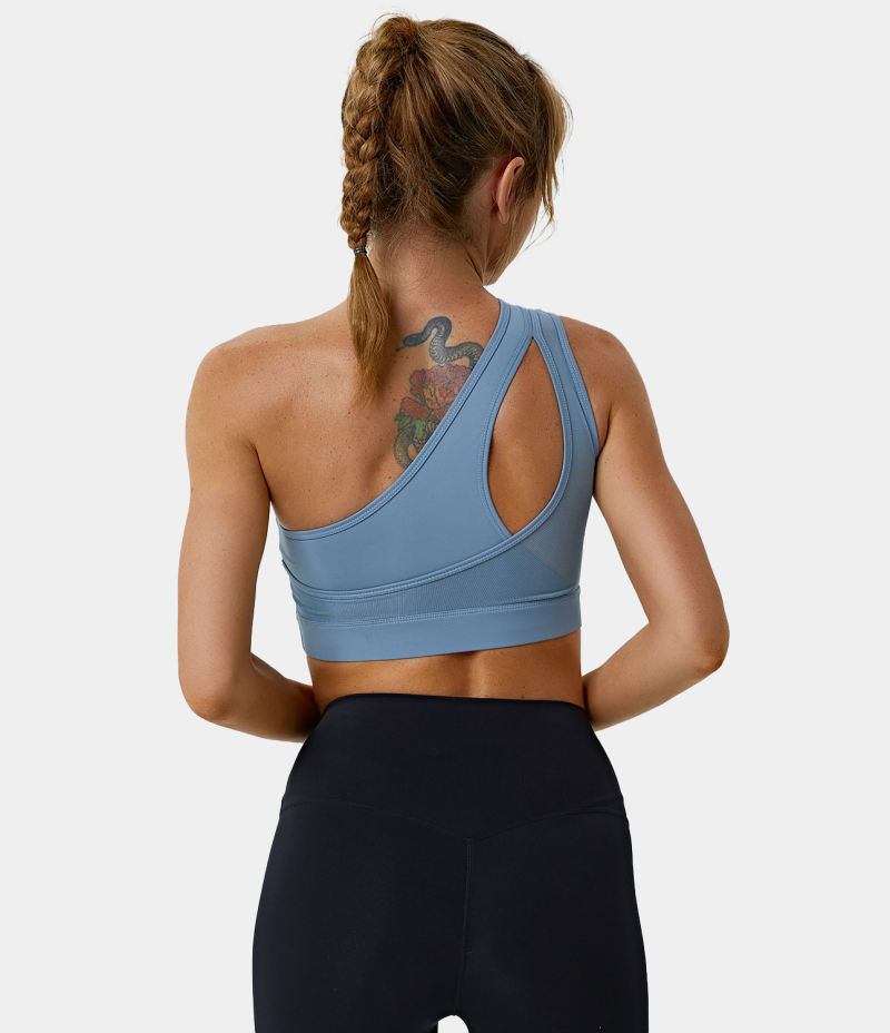 :: Halara Medium Support One Shoulder Cut Out Contrast Mesh Sports Bra Women's Tops Teal | OUHCMLQ-84