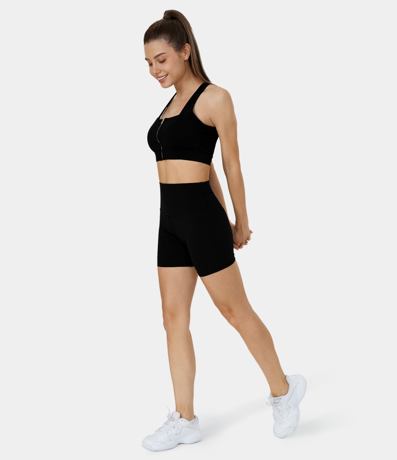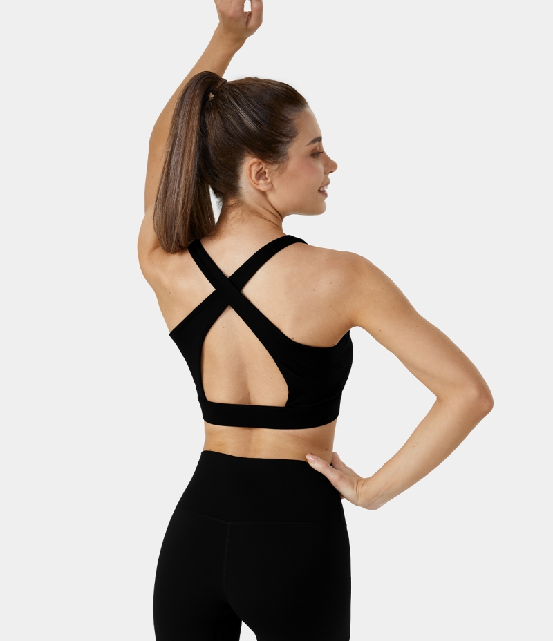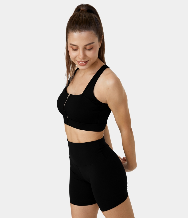 :: Halara Medium Support Zip Front Backless Crisscross Cut Out Training Sports Bra Women's Tops Black | GDRCLAP-73
