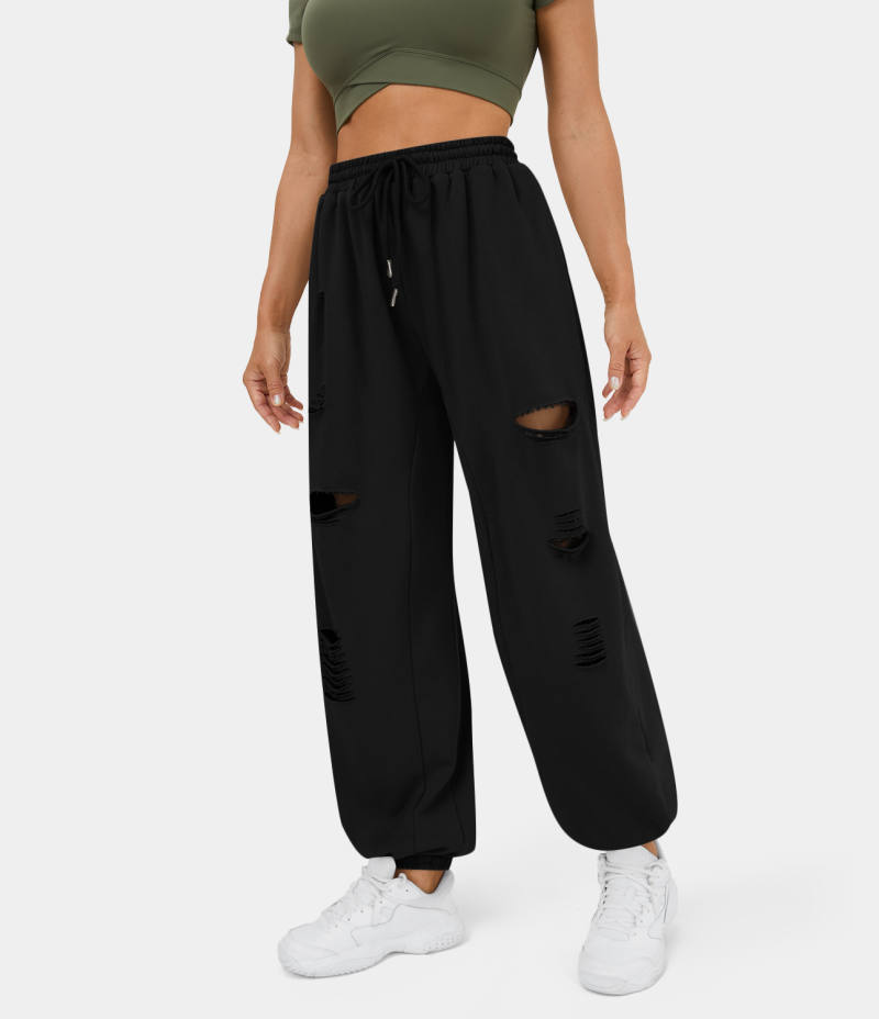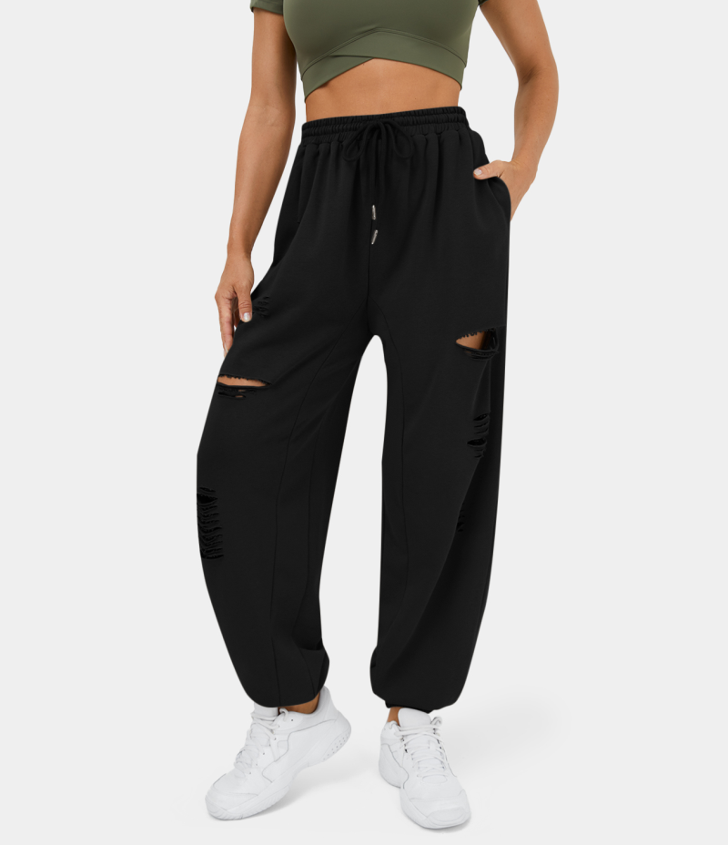 Halara Mid Rise Drawstring Side Pocket Ripped Casual Women's Jogger Black | 635891-IVL
