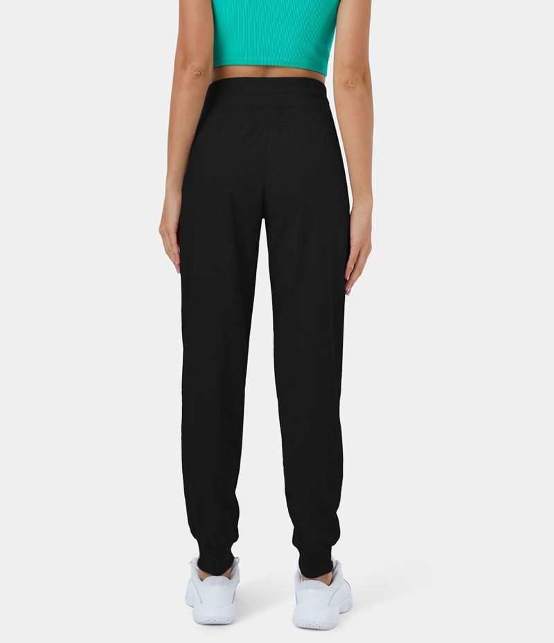 :: Halara Mid Rise Ribbed Drawstring Side Pocket Ruched Striped Casual Women's Jogger Black | 832740-NKD