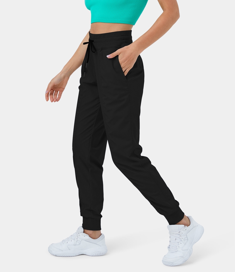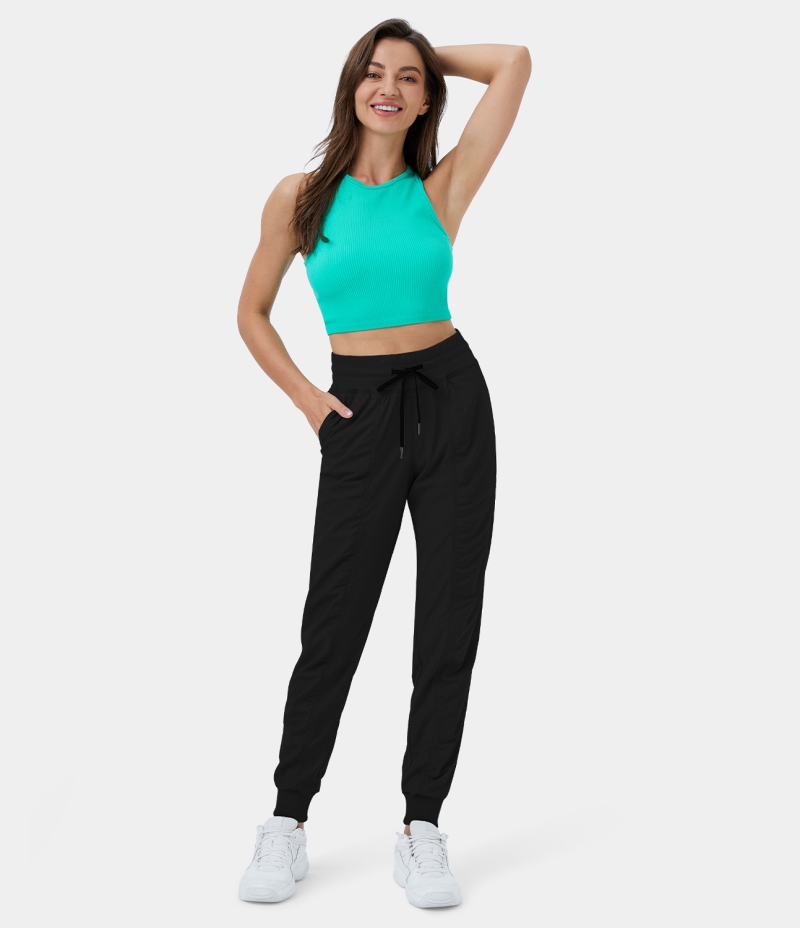 Halara Mid Rise Ribbed Drawstring Side Pocket Ruched Striped Casual Women's Jogger Black | 832740-NKD