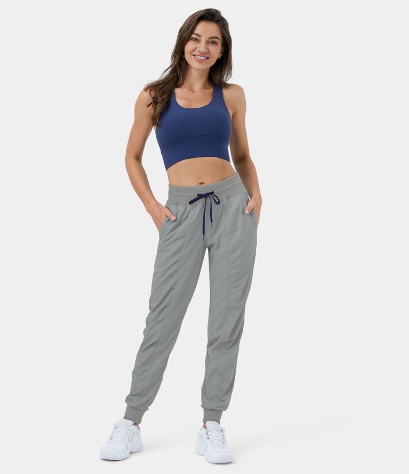 Halara Mid Rise Ribbed Drawstring Side Pocket Ruched Striped Casual Women's Jogger Grey | 950362-WVT