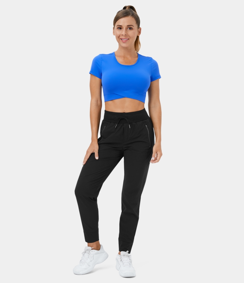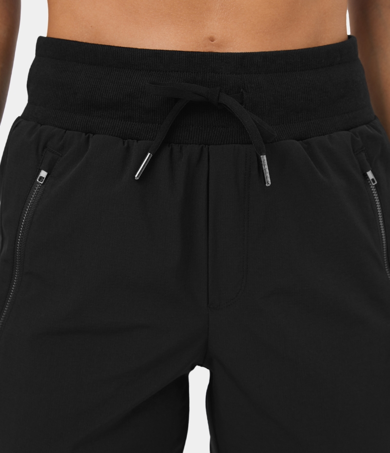 :: Halara Mid Rise Ribbed Drawstring Side Zip Pocket Casual Women's Jogger Black | 456283-KMW
