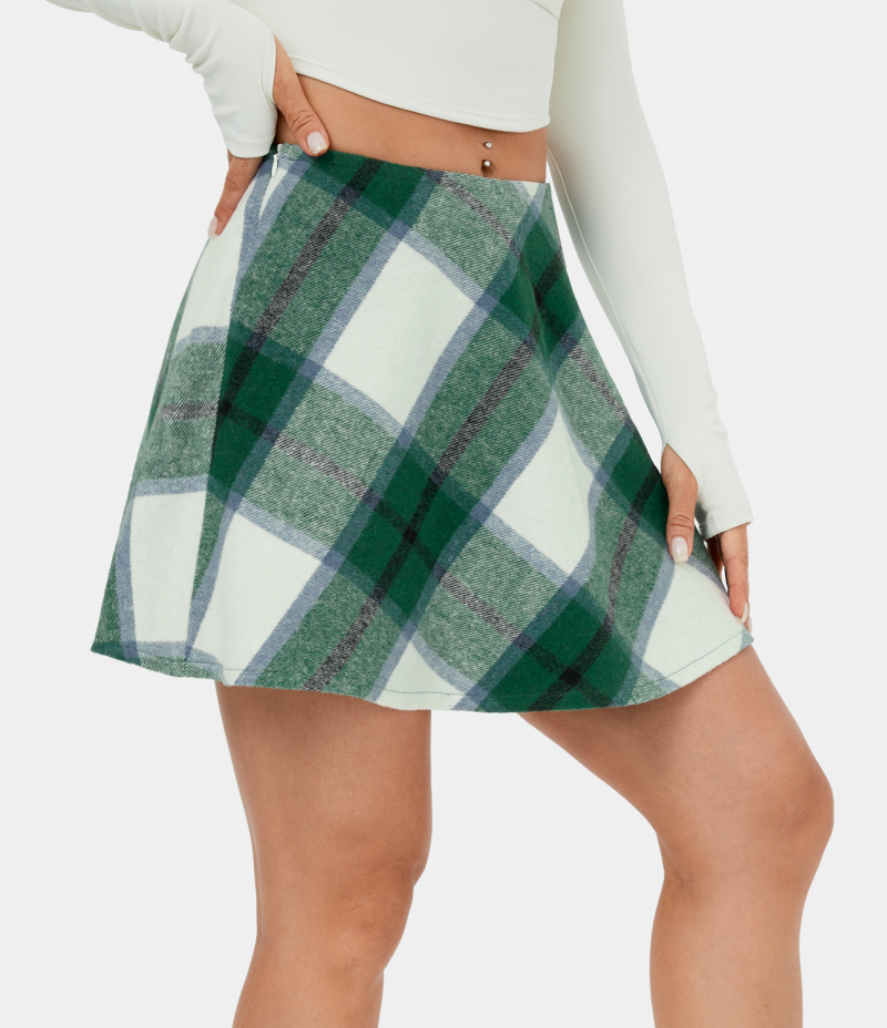 :: Halara Mid Rise Side Zipper A Line 2-in-1 Plaid Fleece Mini Casual Women's Skirts Green White Plaid | 693580-ROZ