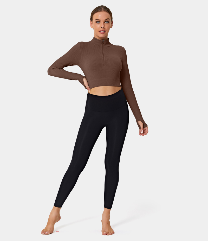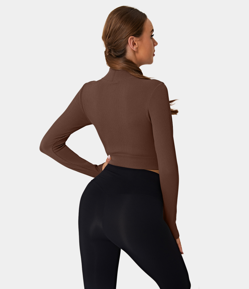 :: Halara Mock Neck Half Zip Thumb Hole Cropped Sports Women's Tops Coffee | RTVZOWD-95