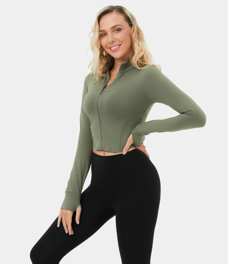 Halara Mock Neck Zip Front Thumb Hole Cropped Golf Jacket Women's Tops Oil Green | IHJOTPG-67