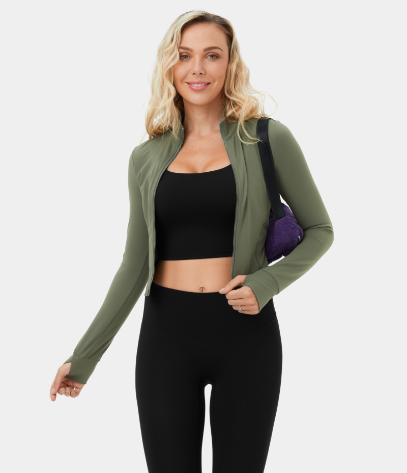 :: Halara Mock Neck Zip Front Thumb Hole Cropped Golf Jacket Women's Tops Oil Green | IHJOTPG-67