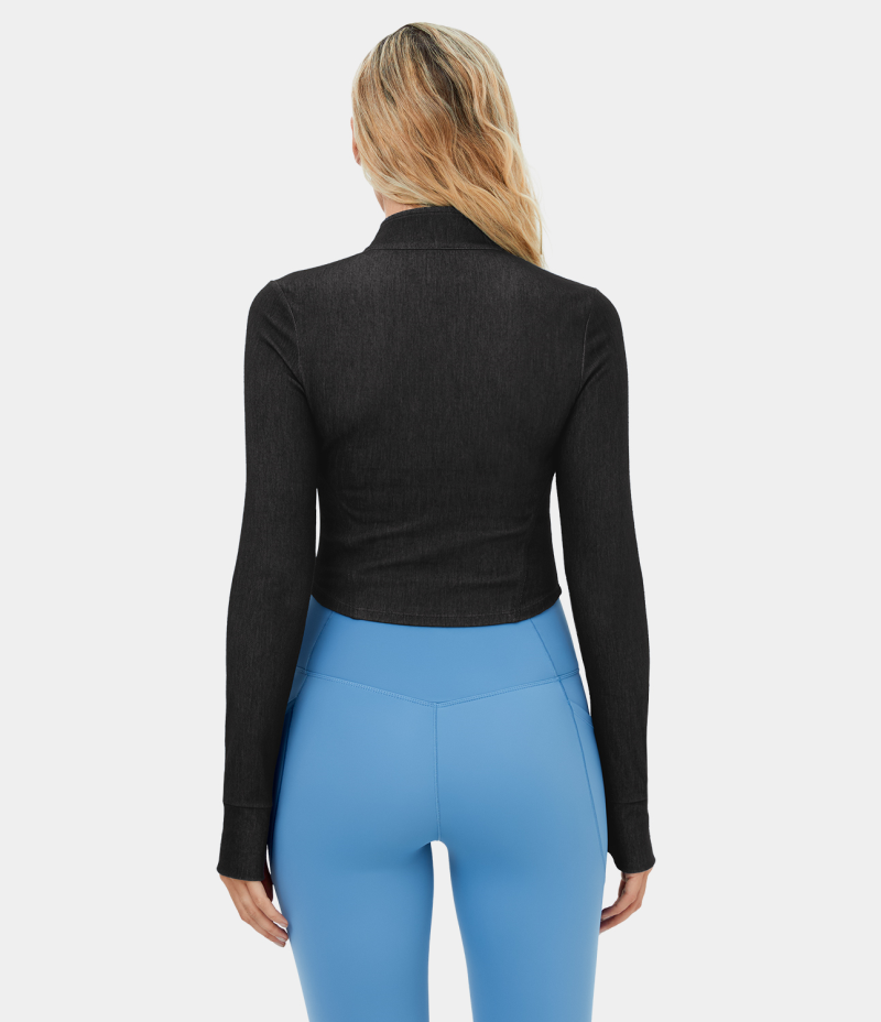 Halara Mock Neck Zip Front Thumb Hole Cropped Stretchy Knit Denim Casual Jacket Women's Tops Black | DQXCTWV-74