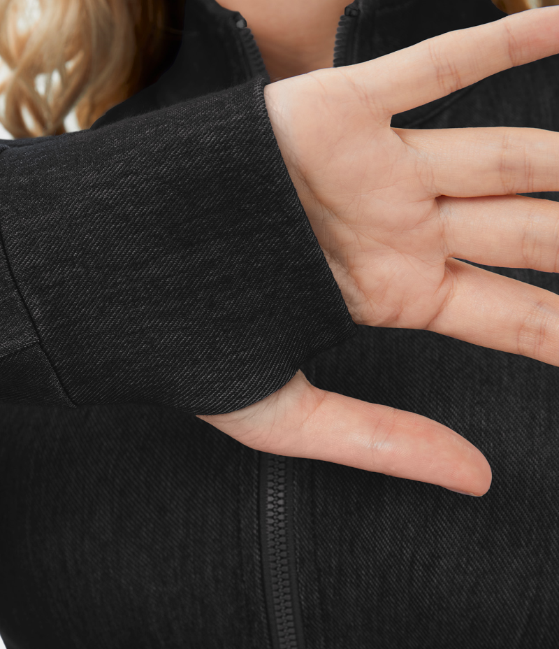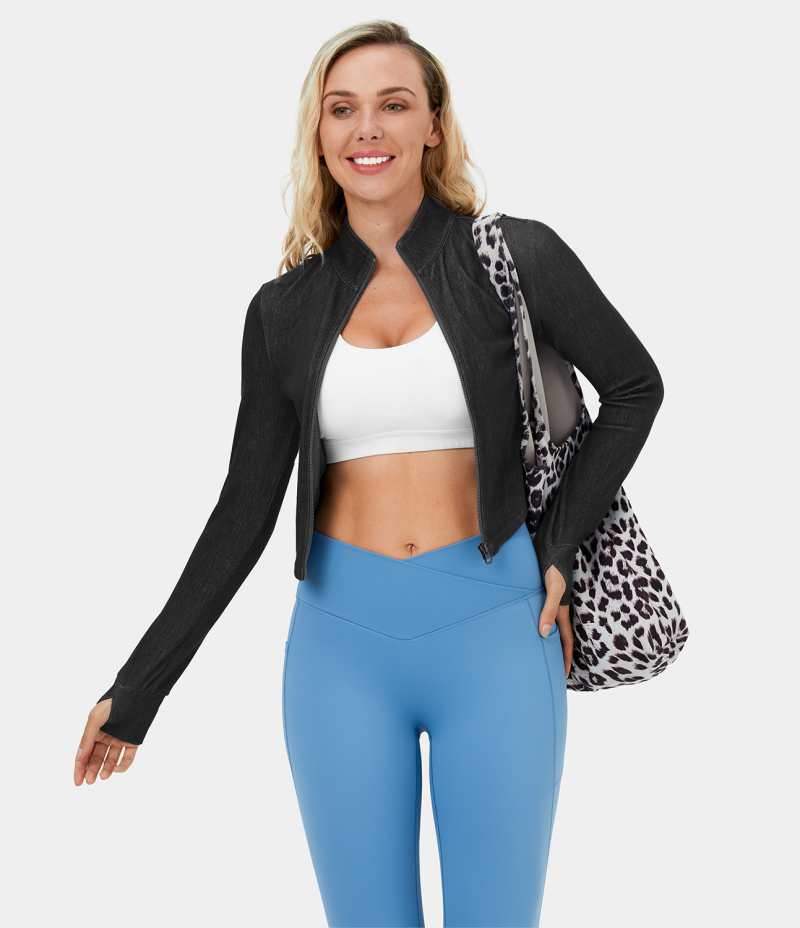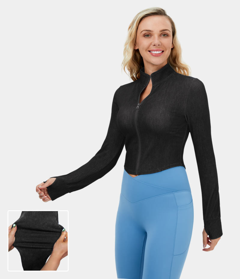 :: Halara Mock Neck Zip Front Thumb Hole Cropped Stretchy Knit Denim Casual Jacket Women's Tops Black | DQXCTWV-74