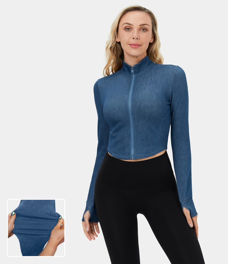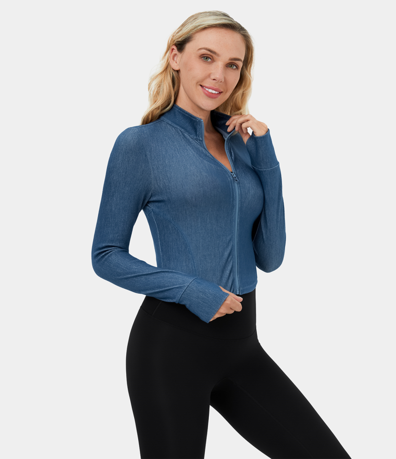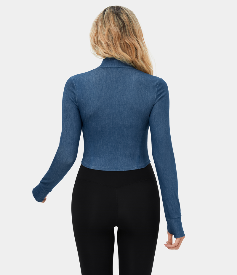 Halara Mock Neck Zip Front Thumb Hole Cropped Stretchy Knit Denim Casual Jacket Women's Tops Paeonia Ocean Blue | HQFZMIG-41