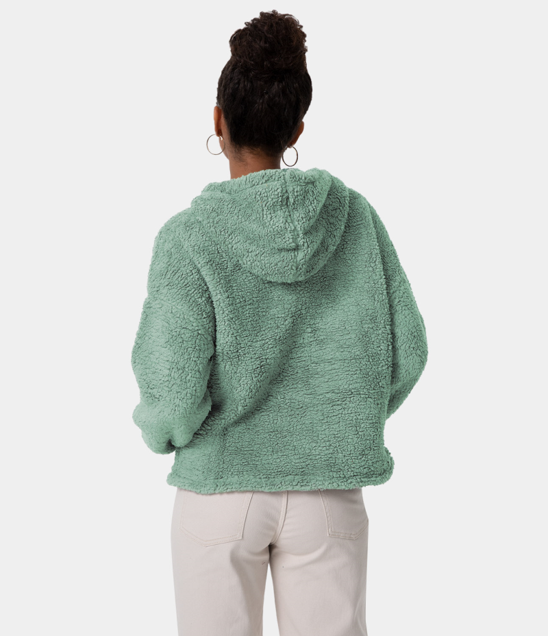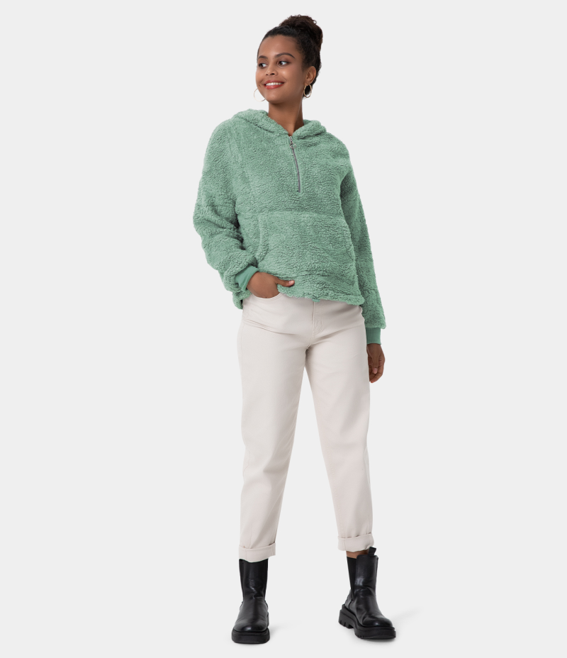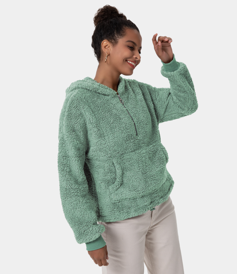:: Halara O Ring Half Zip Kangaroo Pocket Teddy Pullover Hoodie Sweatshirt Women's Tops Seafoam | RCYXGDA-85