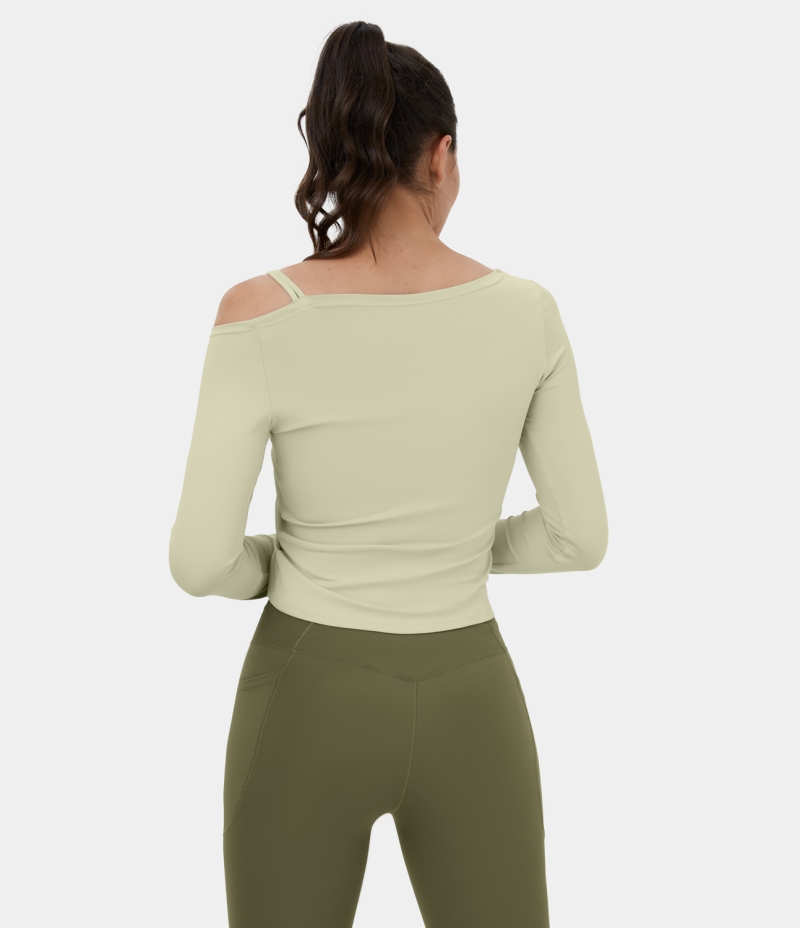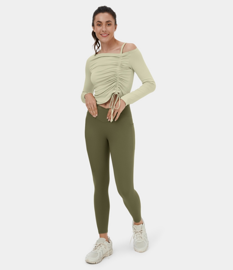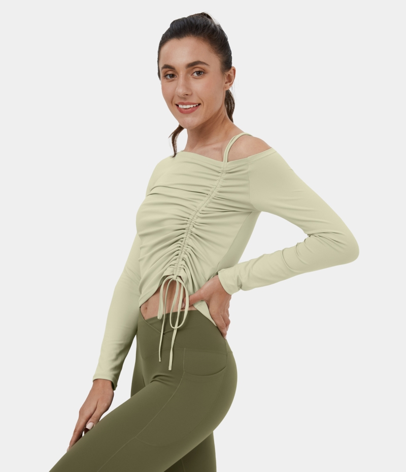 :: Halara Off Shoulder Ruched Drawstring Cropped Dance Sports Women's Tops Aloe Wash | IOXFRSC-03