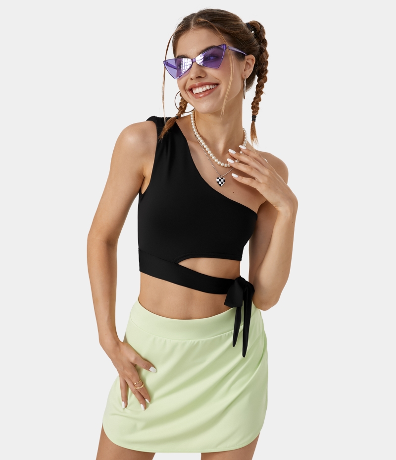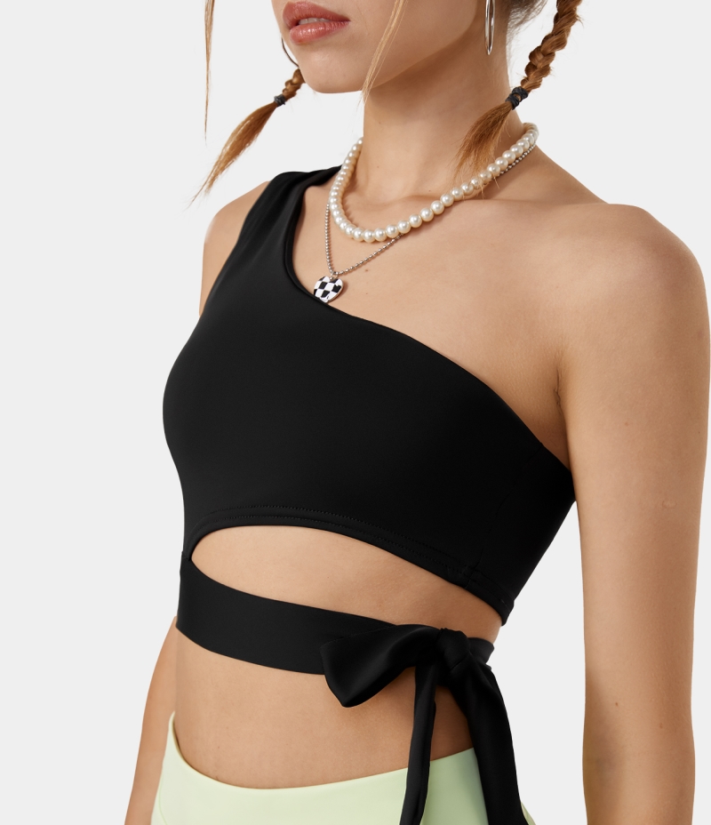 :: Halara One Shoulder Lace Up Cut Out Cropped Casual Tank Women's Tops Black | WVRHDBP-52