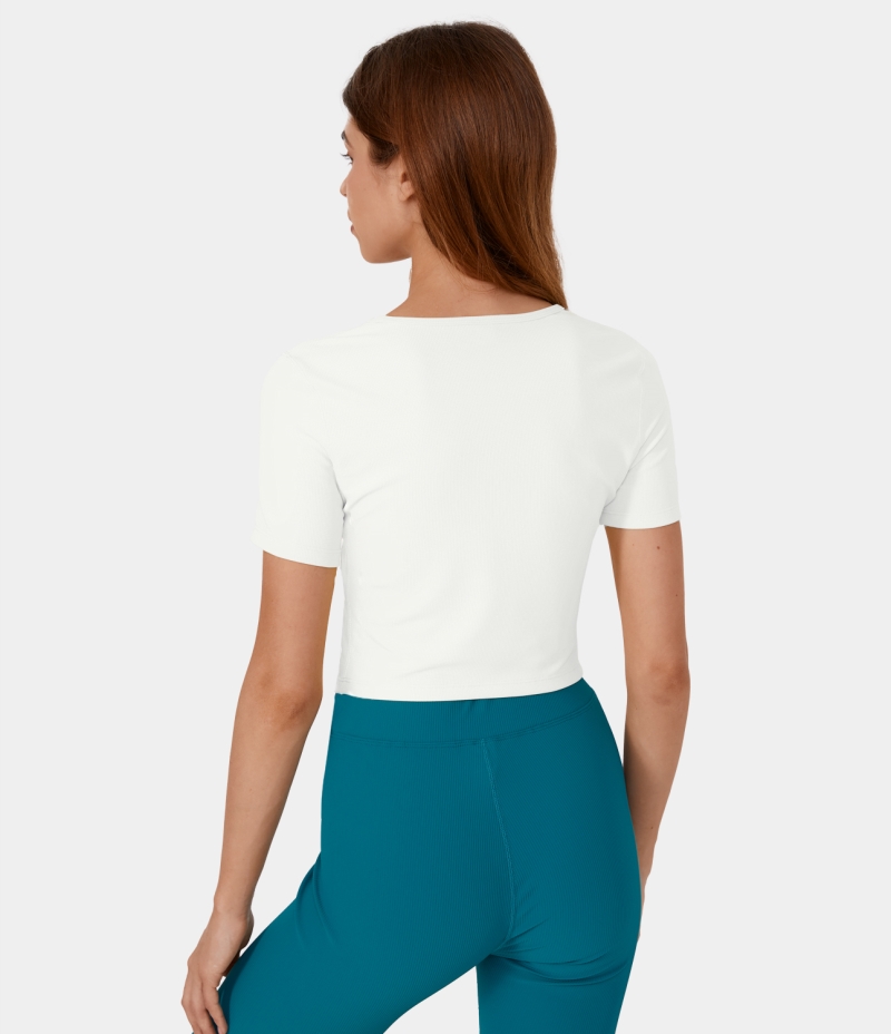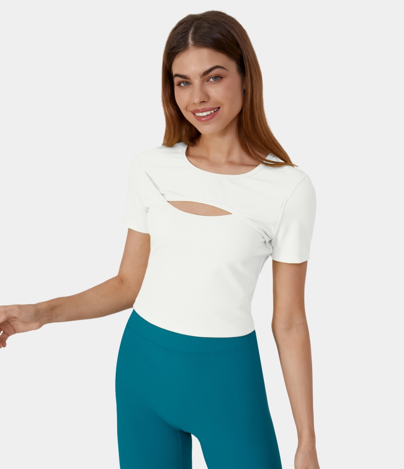 :: Halara Patitoff Flow Pet Hair Resistant Round Neck Cut Out Cropped Barre Ballet Dance Women's Tops White | FJDKXNH-51