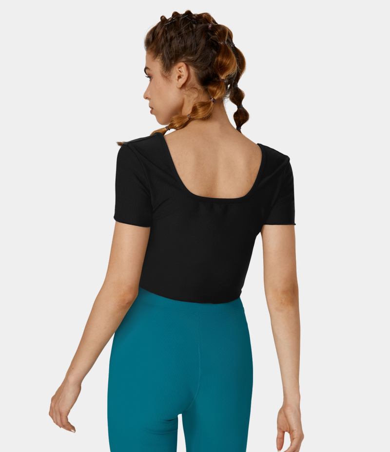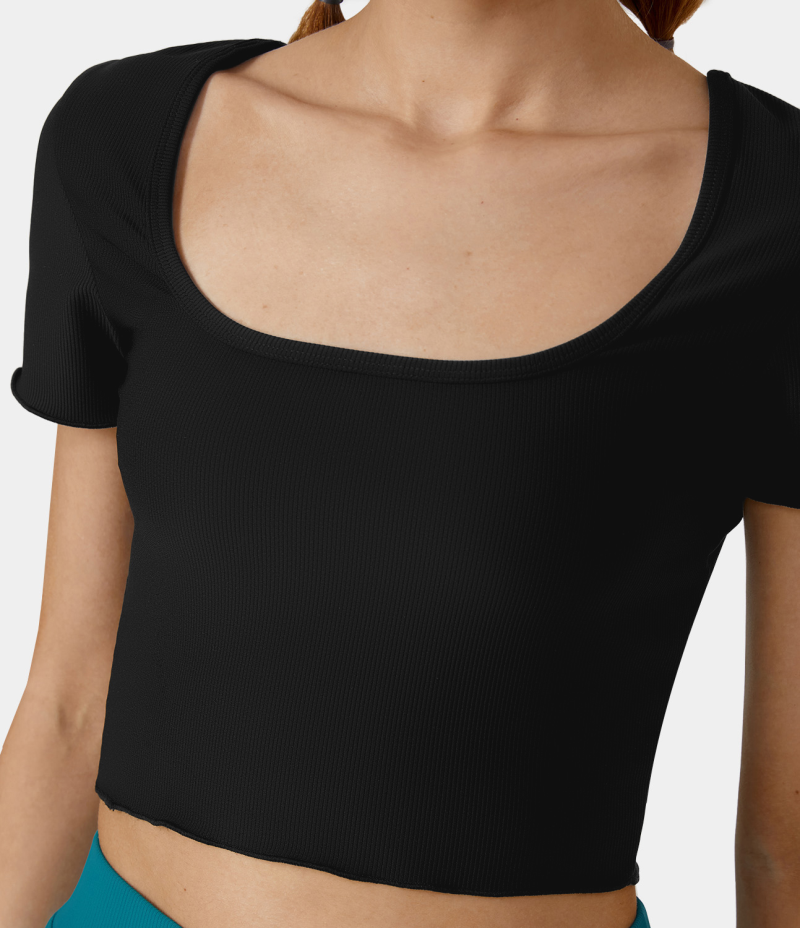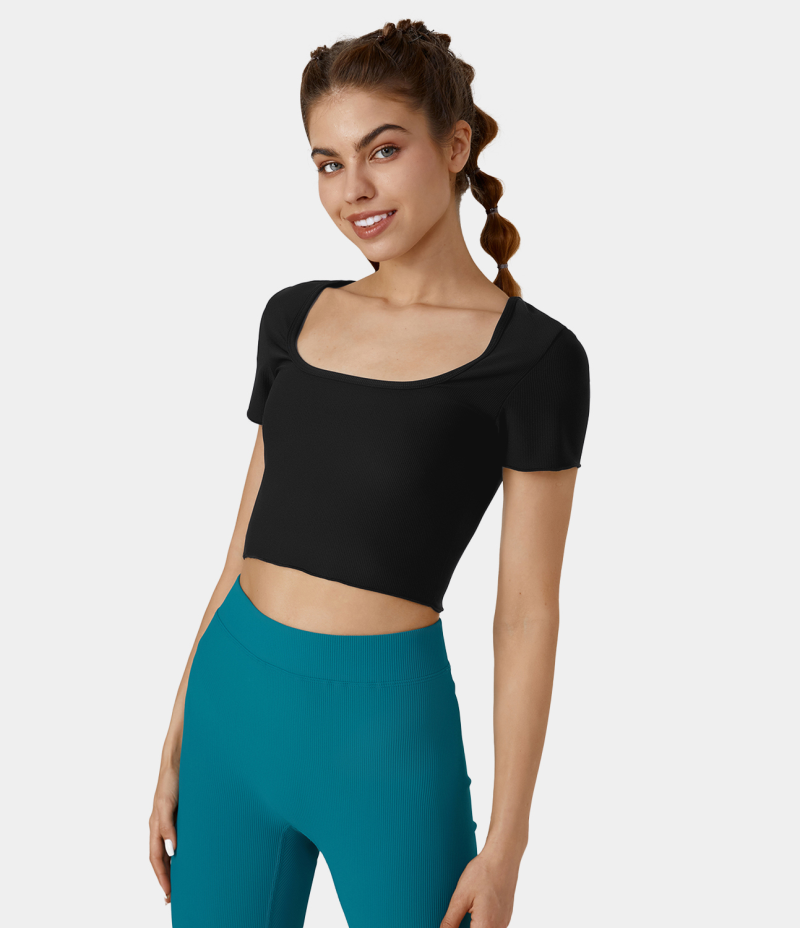 :: Halara Patitoff Flow Pet Hair Resistant Square Neck Frill Hem Cropped Sports Women's Tops Black | YZQCHSV-85