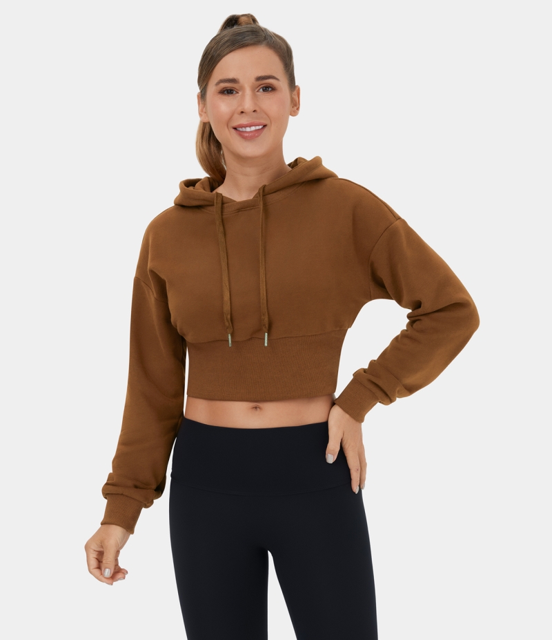 :: Halara Removable Hood Drawstring Cropped Fleece Casual Hoodie Sports Sweatshirt Women's Tops Coffee | OAYJMHR-04