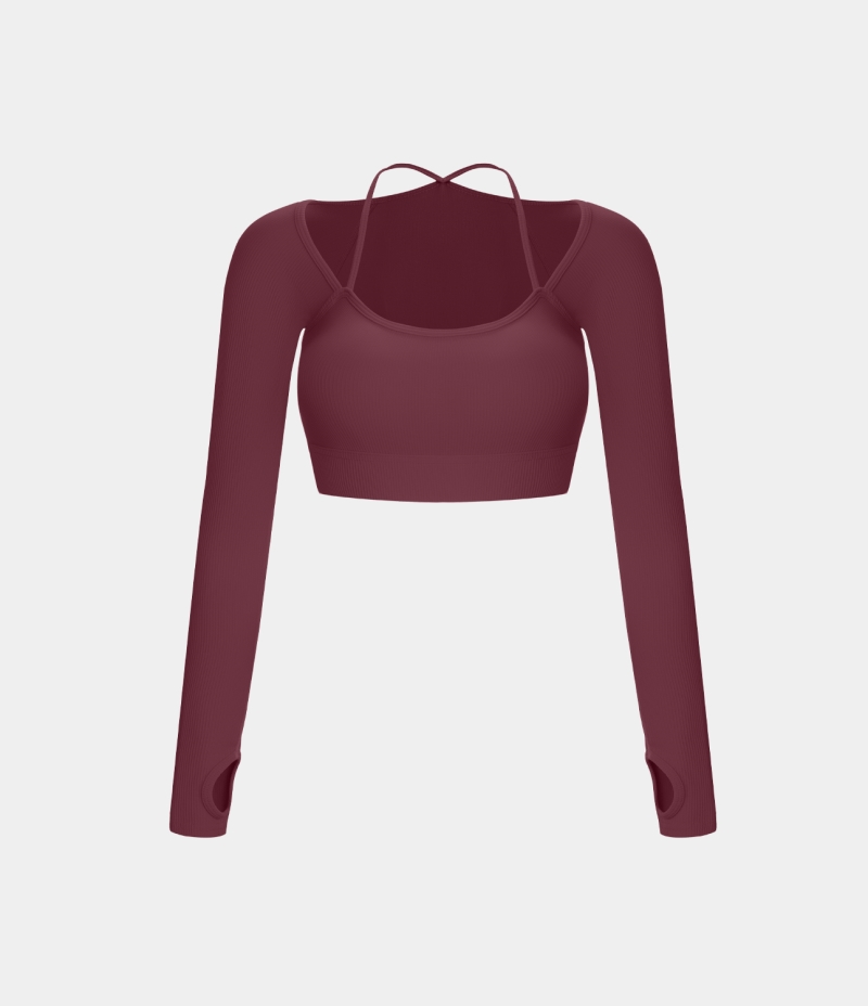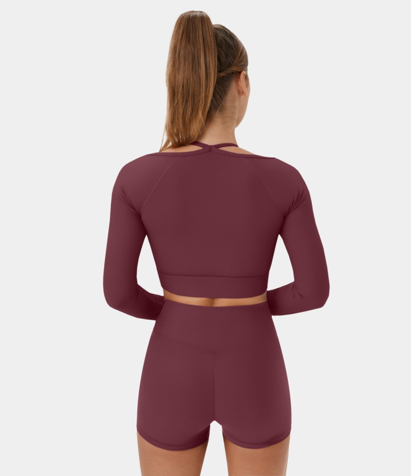 :: Halara Ribbed Halter Strap Thumb Hole Cropped Yoga Sports Women's Tops New Maroon | WYHICUZ-38
