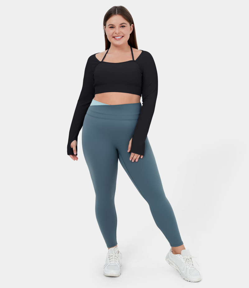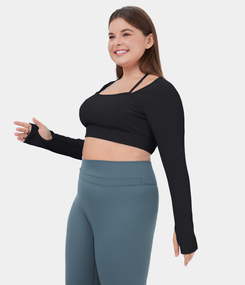 Halara Ribbed Halter Strap Thumb Hole Plus Size Cropped Yoga Sports Women's Tops Black | IGCTQHF-63