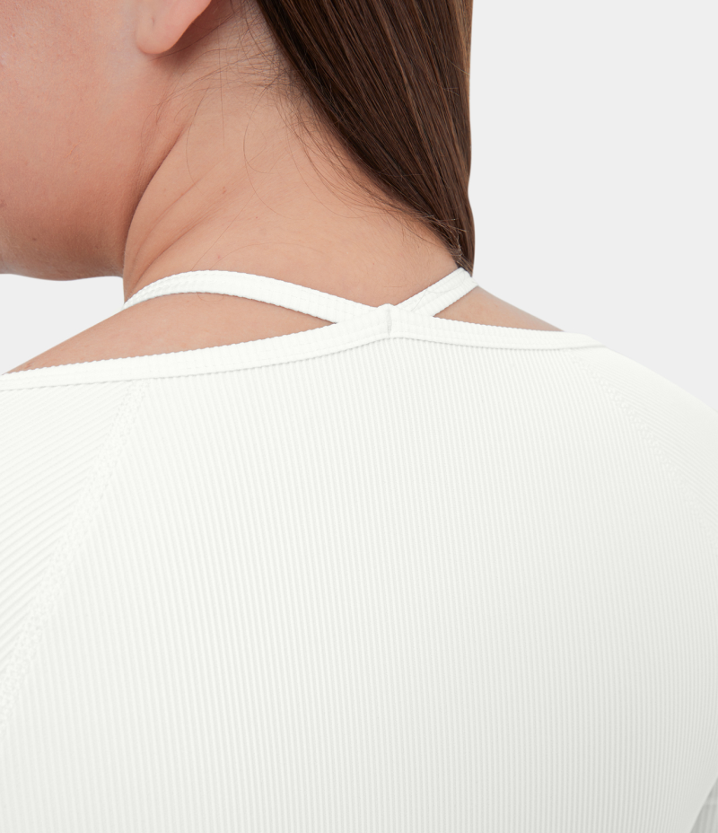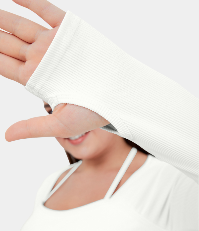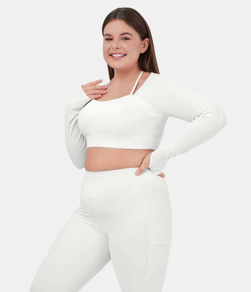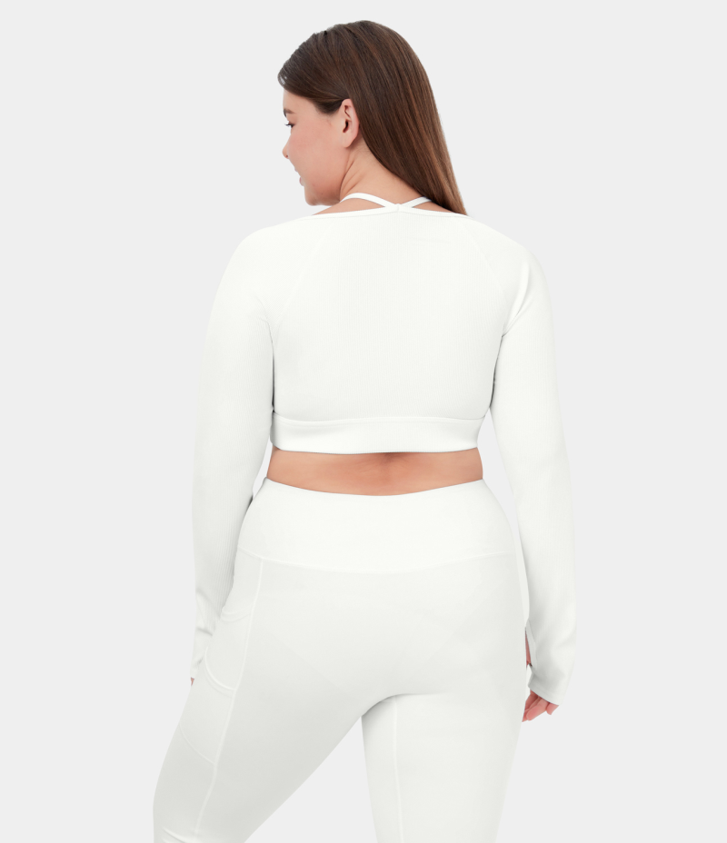 :: Halara Ribbed Halter Strap Thumb Hole Plus Size Cropped Yoga Sports Women's Tops White | XBGLIRS-67