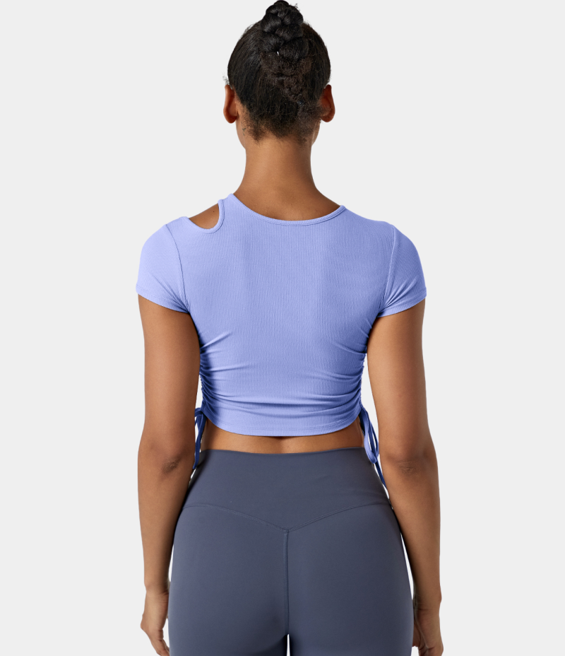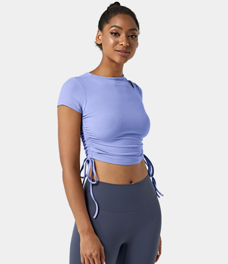 :: Halara Ribbed Knit Cut Out Side Drawstring Ruched Cropped Women's Tops Deep Powder Blue | TJPCKBG-67