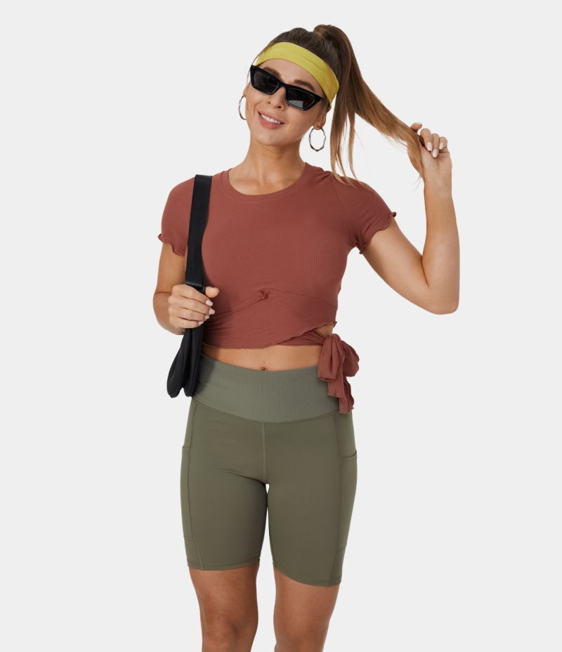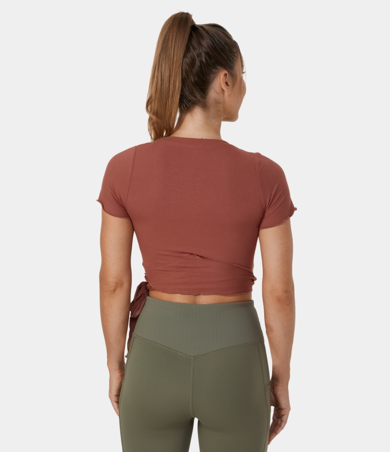 :: Halara Ribbed Knit Frill Lace Up Cut Out Cropped Barre Ballet Dance Tank Women's Tops Chutney | OFQRHVL-94