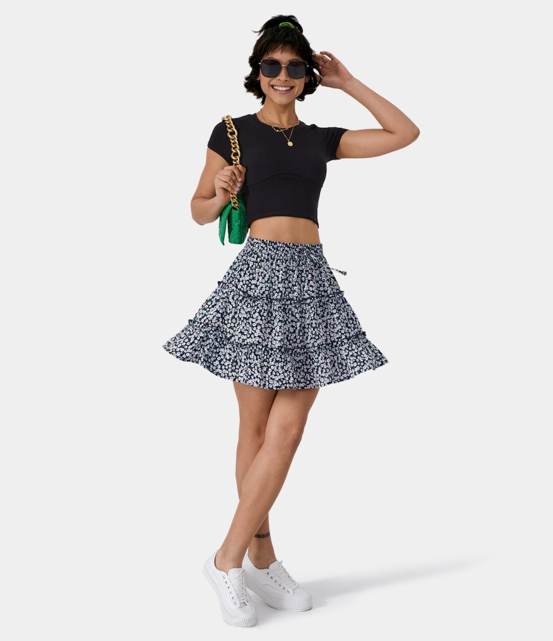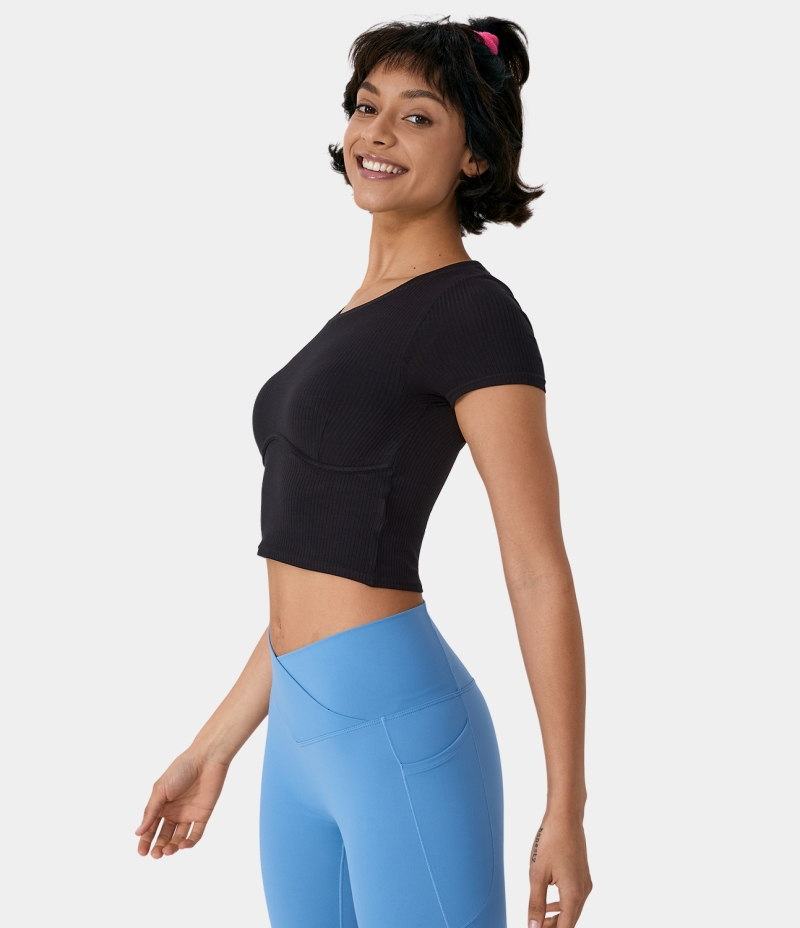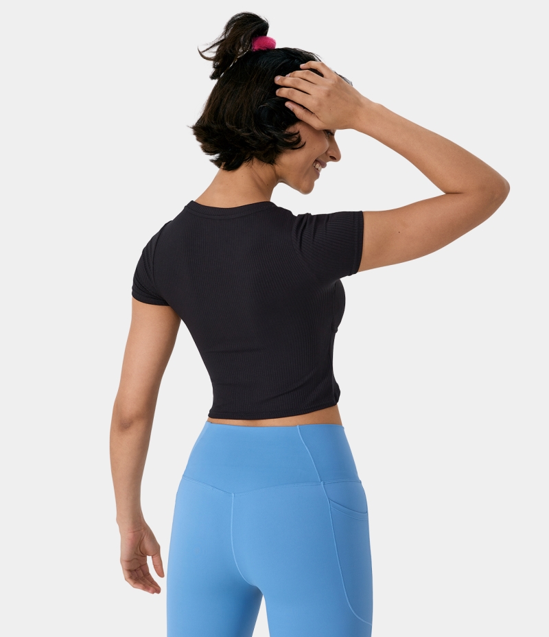 :: Halara Ribbed Knit Round Neck Short Sleeve Cropped T-Shirt Women's Tops Black | XKIQBDO-45