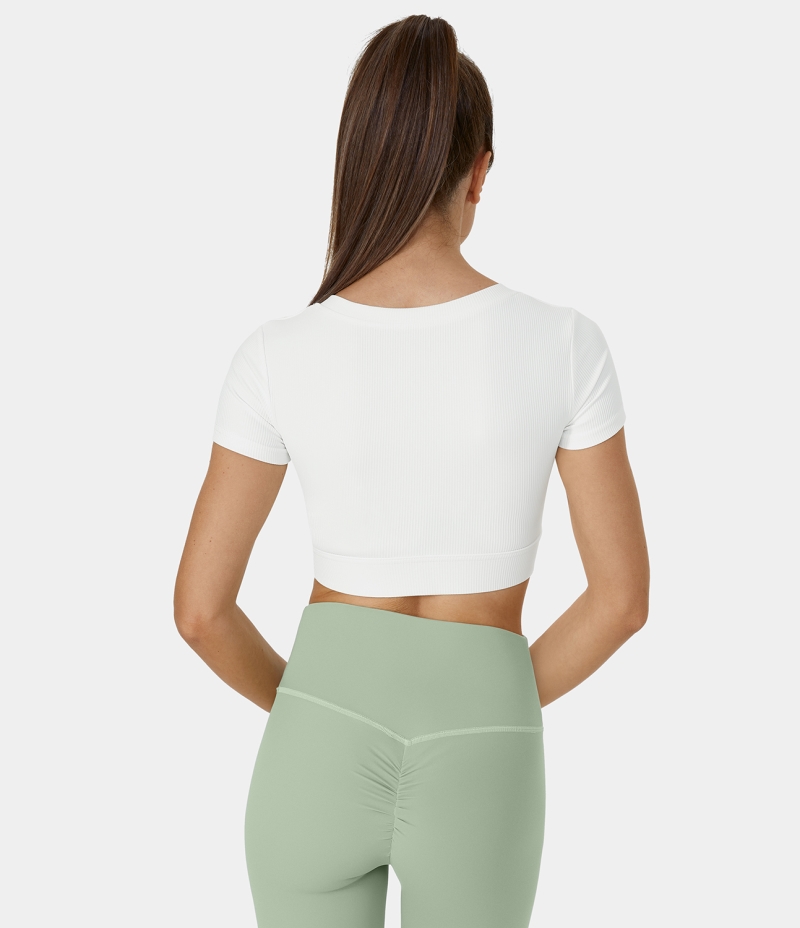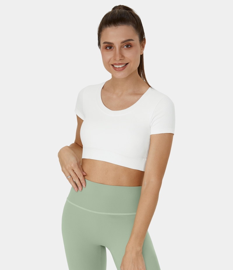 :: Halara Ribbed Knit Short Sleeve Cropped Yoga Sports Women's Tops White | UGMWRHB-09