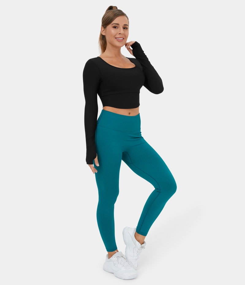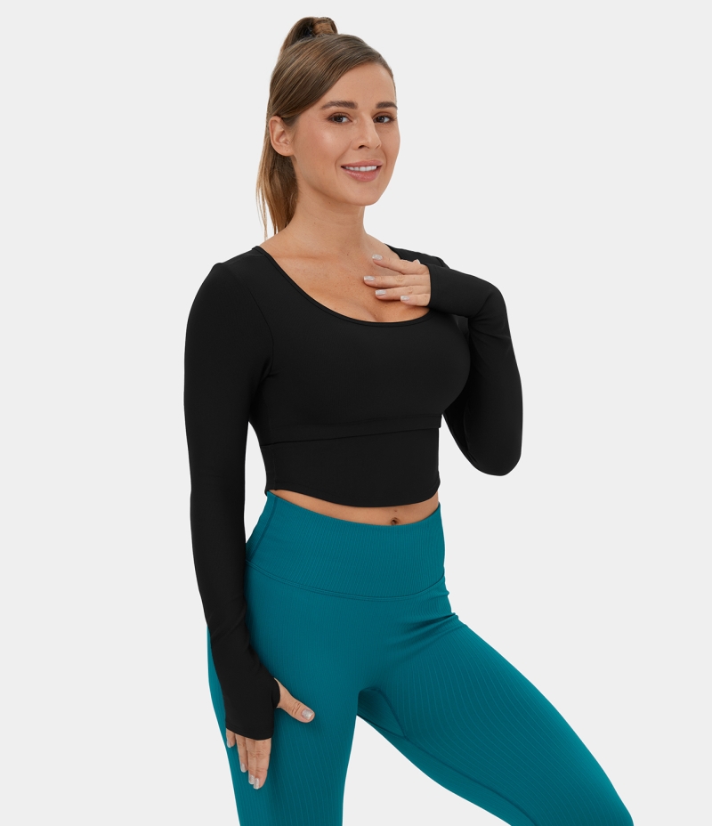 :: Halara Ribbed Knit Thumb Hole Asymmetric Hem Cropped Yoga Sports Women's Tops Black | DBNSLZX-10