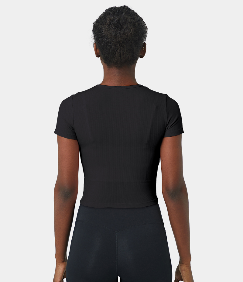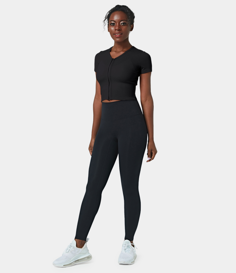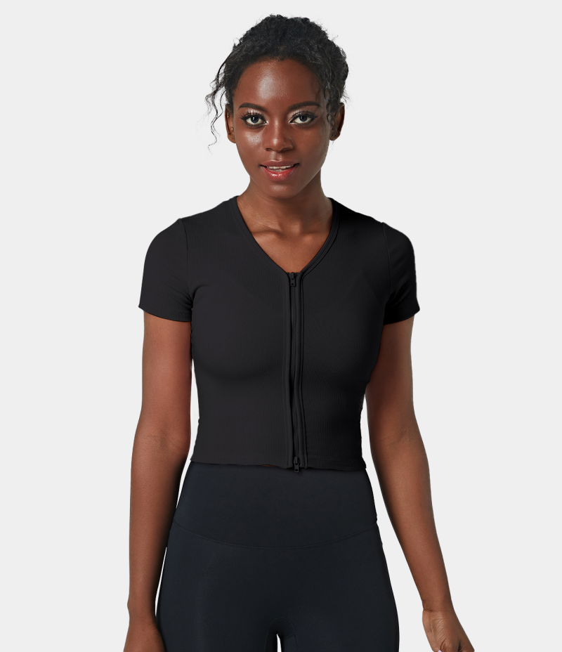 :: Halara Ribbed Knit V Neck Zip Up Cropped Women's Tops Black | ISDJVKO-28