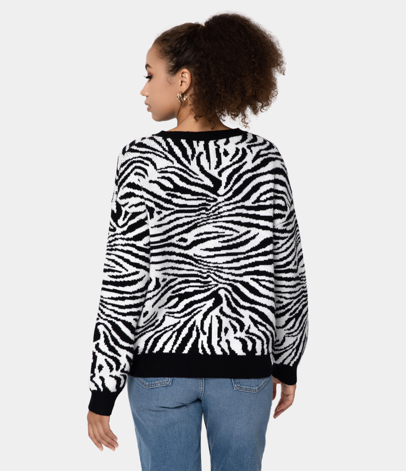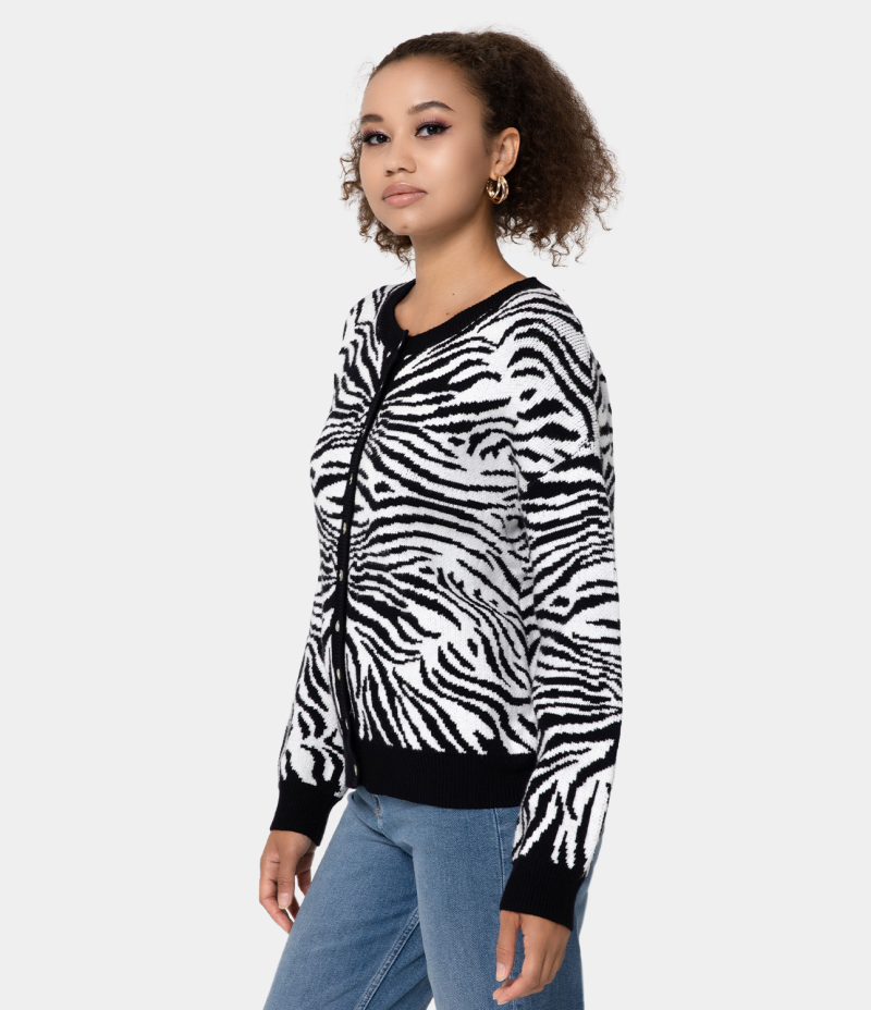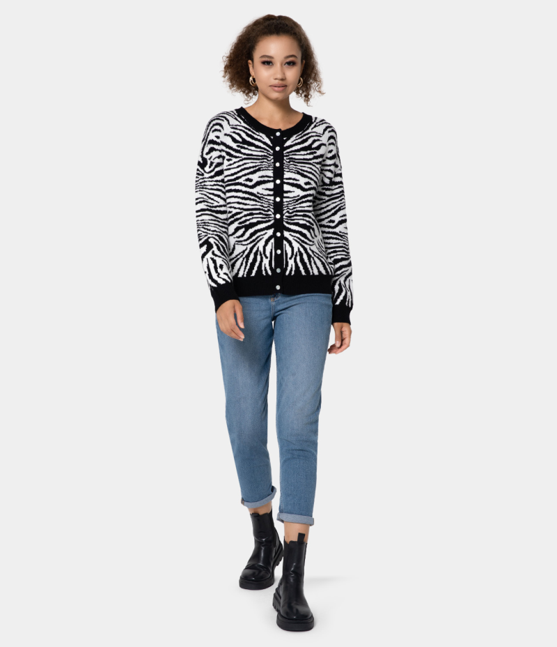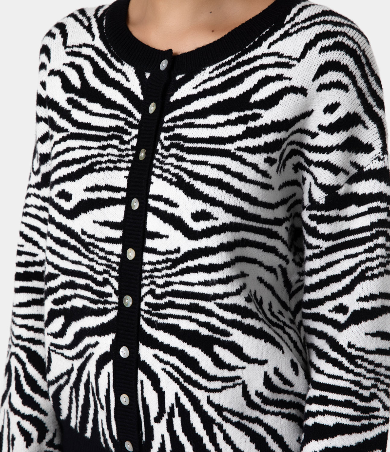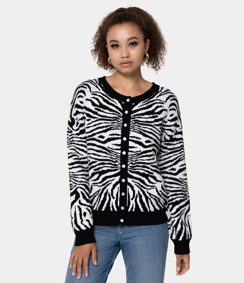 :: Halara Round Neck Button Front Animal Print Cardigan Women's Tops Black | BWPOKQG-50