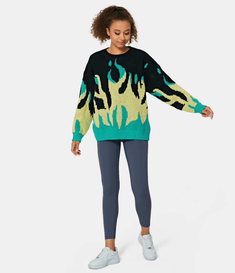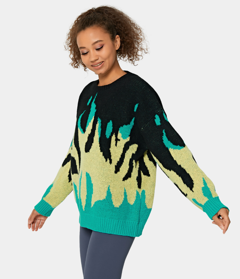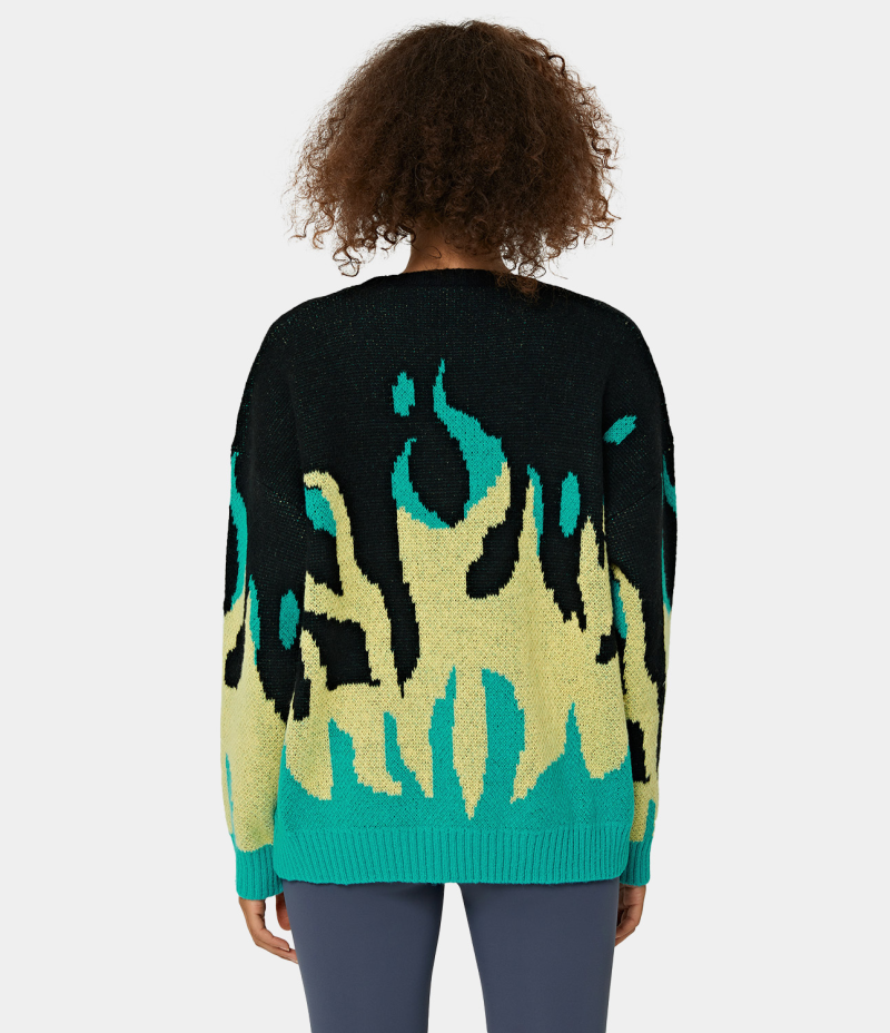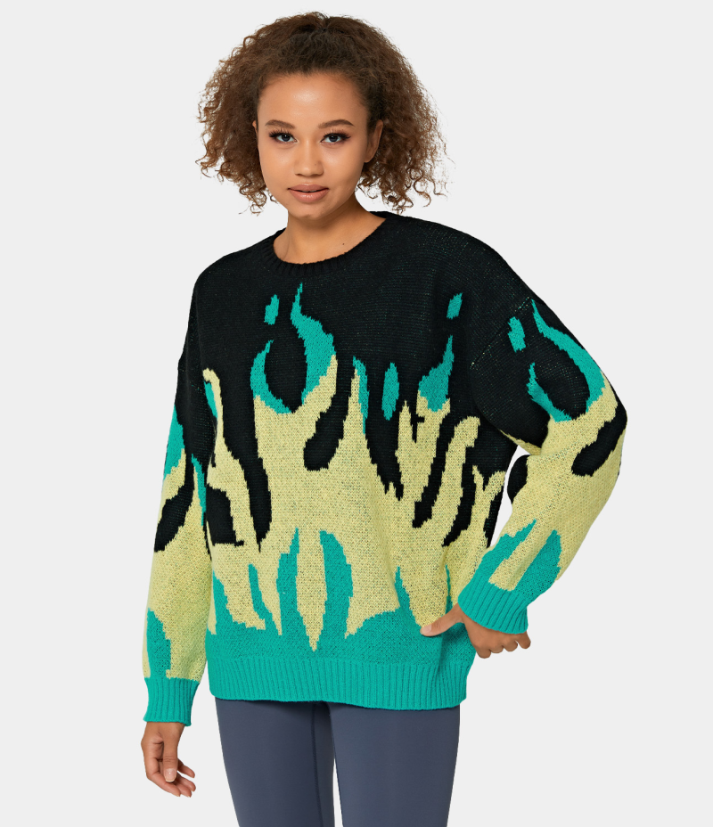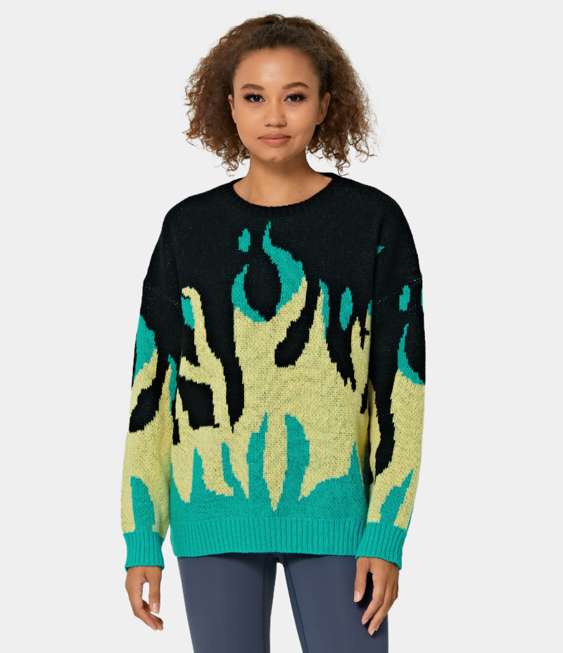Halara Round Neck Color Block Fire Pattern Sweater Women's Tops Pine Green | YFITREW-53