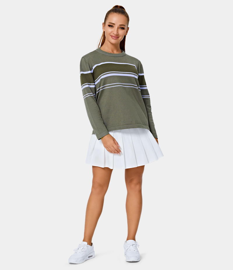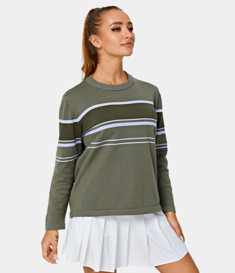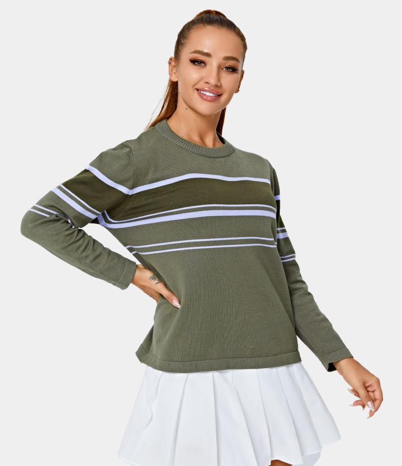 Halara Round Neck Color Block Striped Sweater Women's Tops Deep Olive | AKYXZWM-81