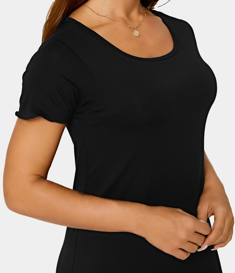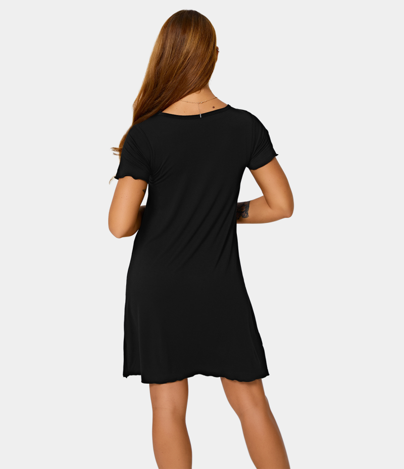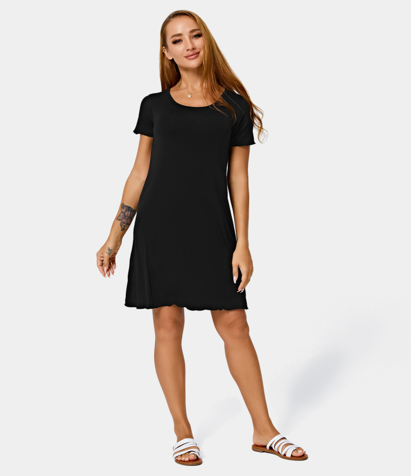 :: Halara Round Neck Frill Trim Plain Lounge Women's Dress Black | 625879-BQD
