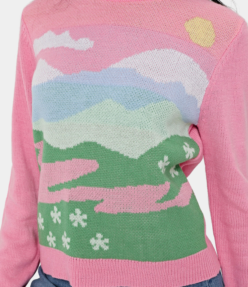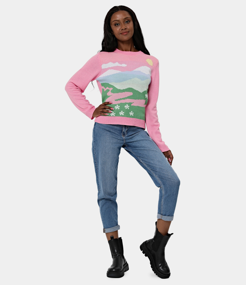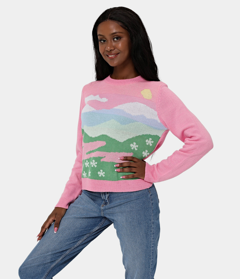 :: Halara Round Neck Landscape Print Pullover Sweater Women's Tops Pink | SGJUZRN-98