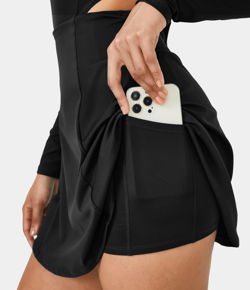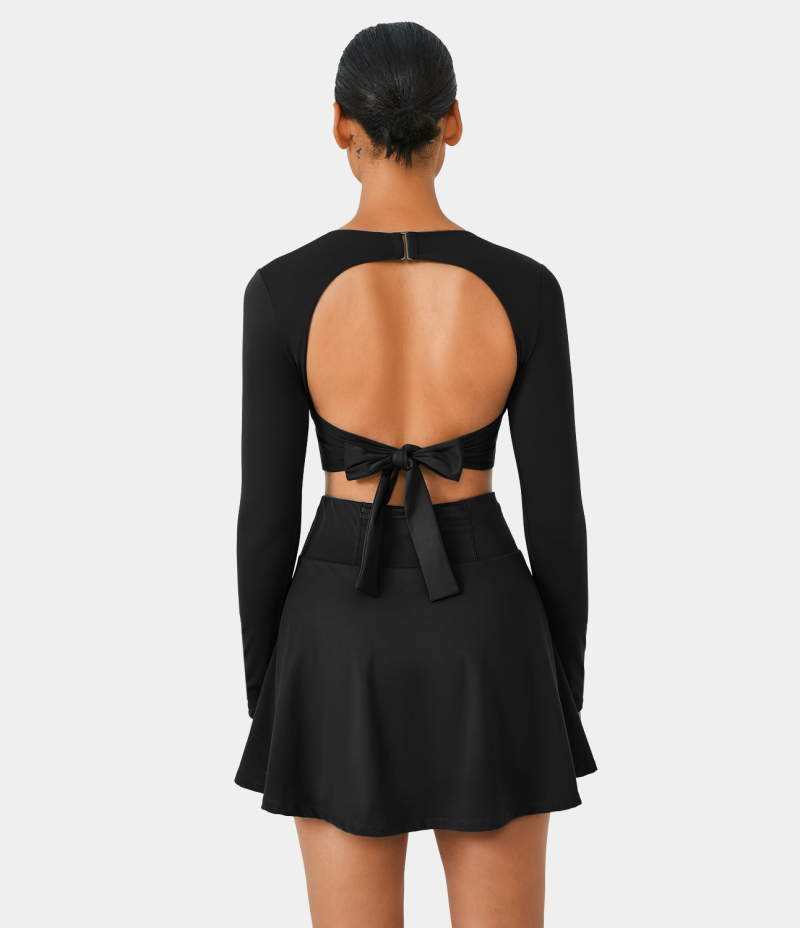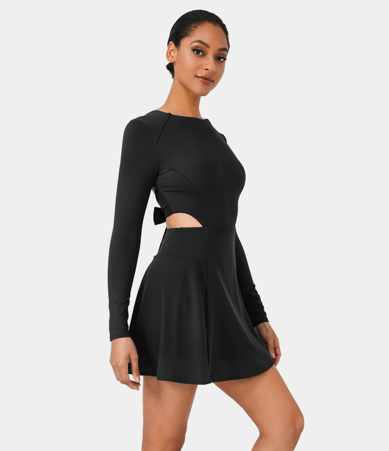 :: Halara Round Neck Long Sleeve Tie Back Cut Out 2-in-1 Backless Women's Dress Black | 154926-EVF