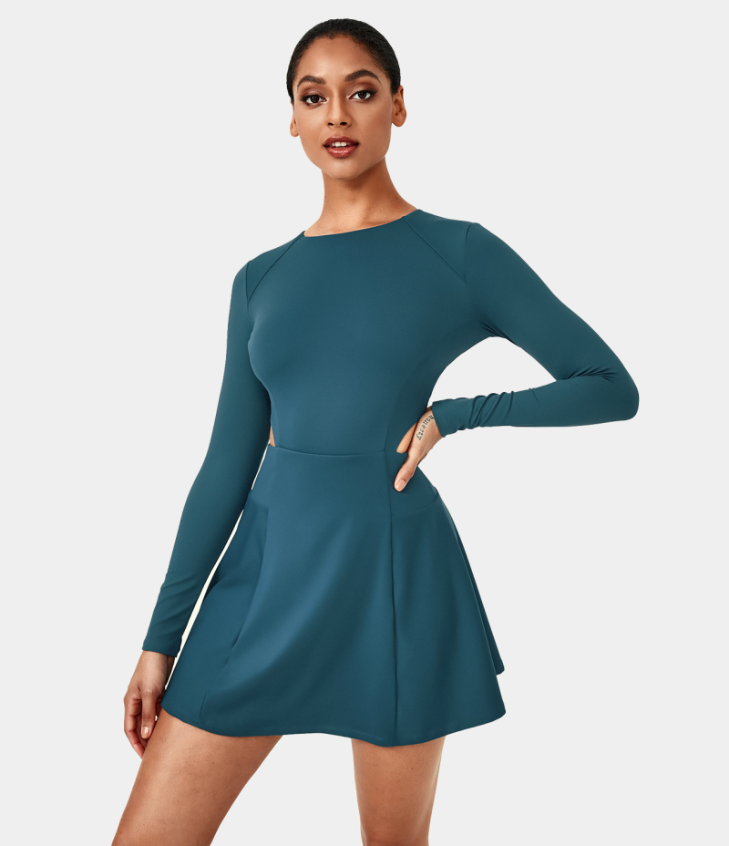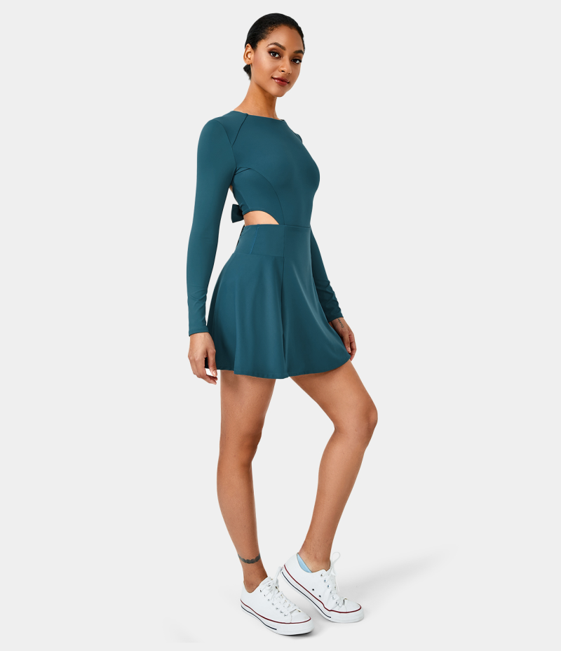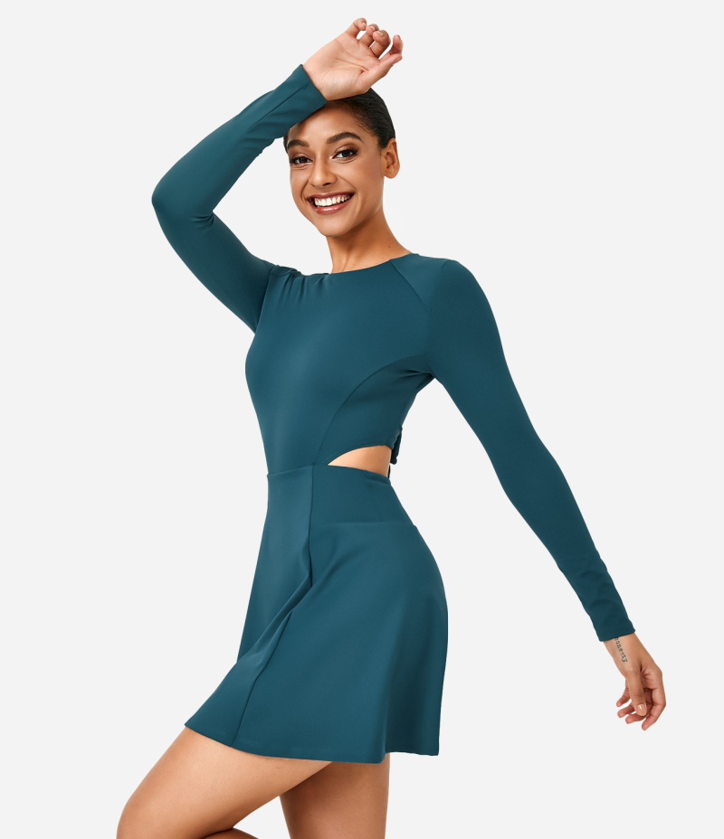 :: Halara Round Neck Long Sleeve Tie Back Cut Out 2-in-1 Backless Women's Dress Oxford Blue | 149627-BPE