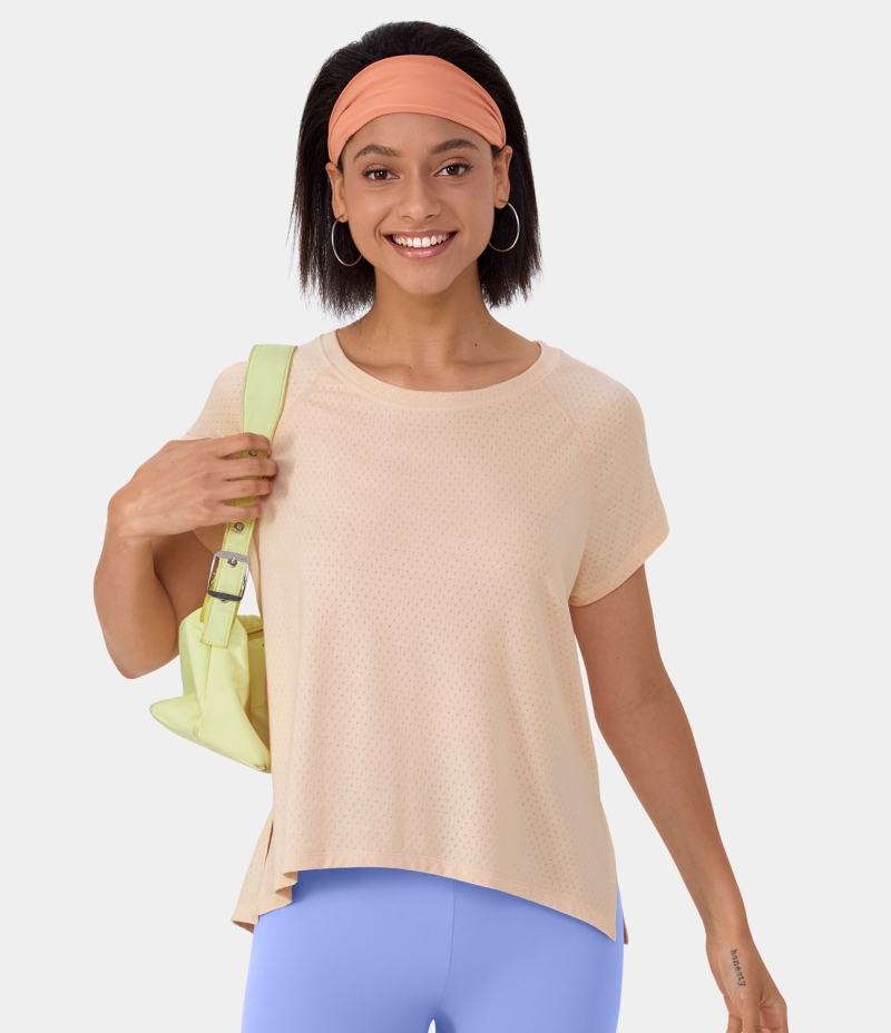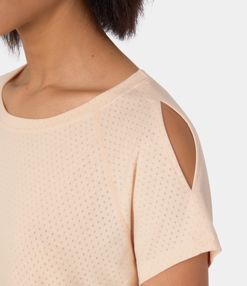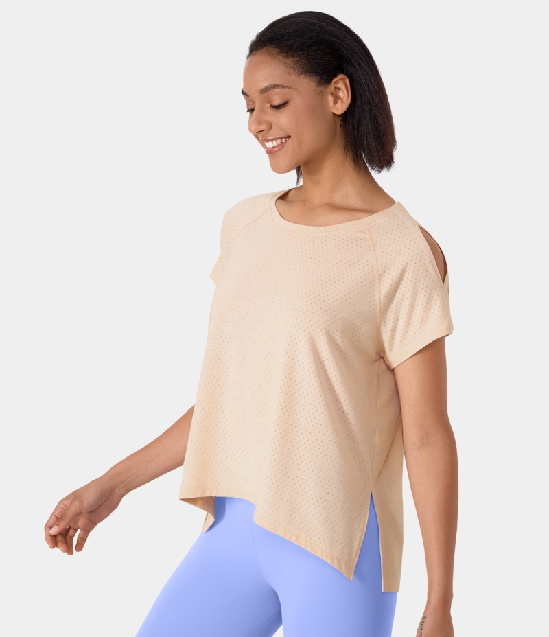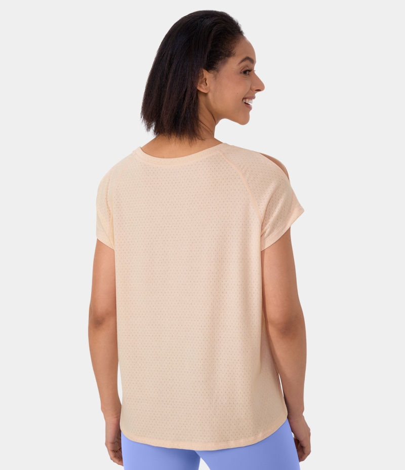 :: Halara Round Neck Short Sleeve Cold Shoulder Casual Sports Women's Tops White Smoke | GVJQMXA-35
