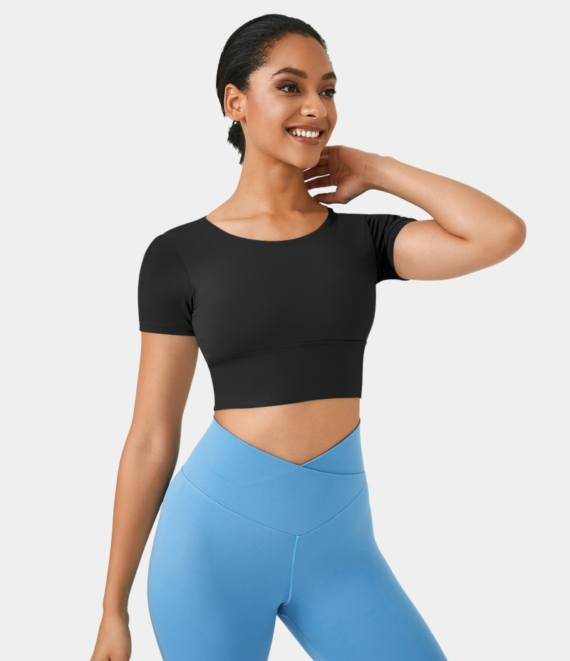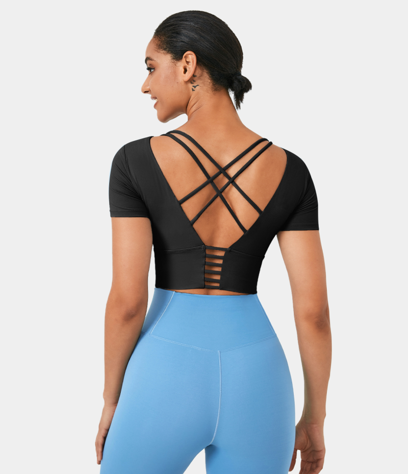 :: Halara Round Neck Short Sleeve Crisscross Cropped Sports Women's Tops Black | CBZMYOX-31